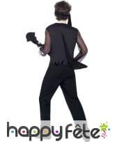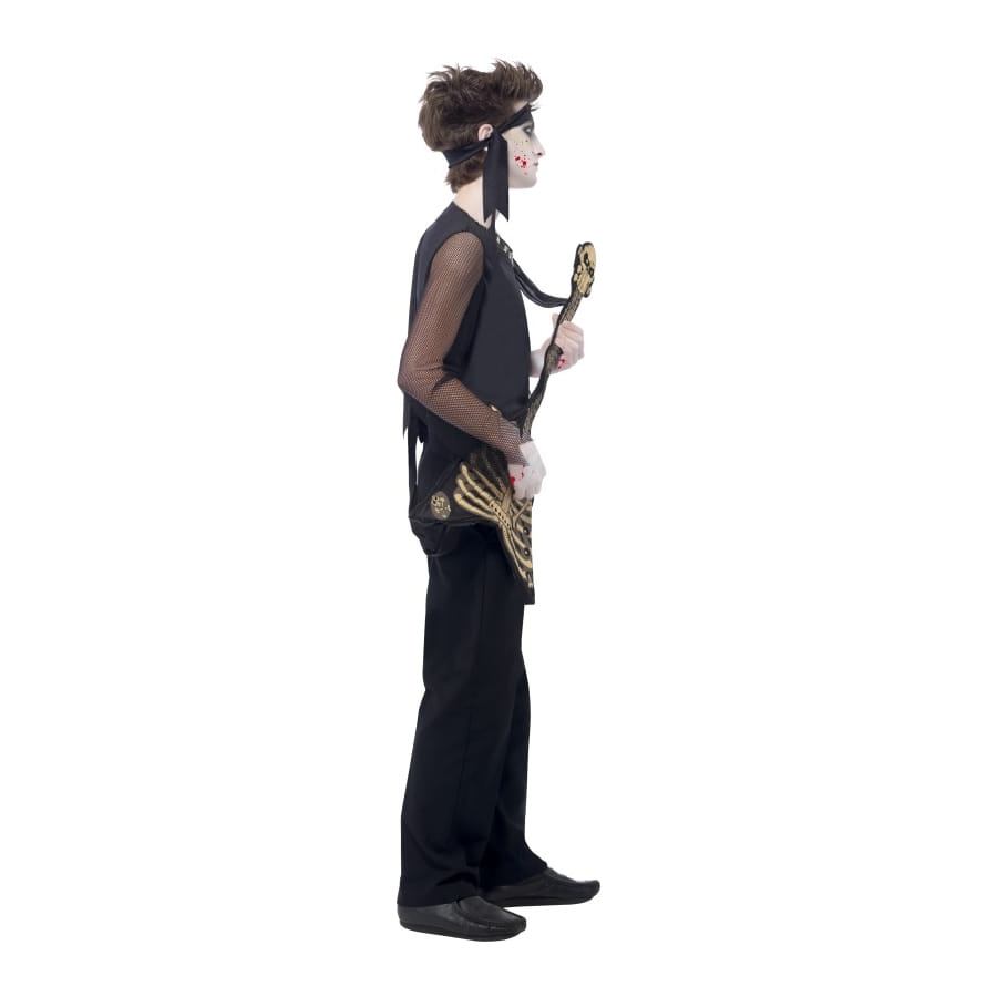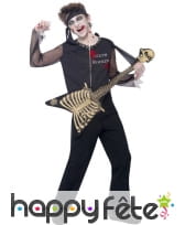Déguisement de rockeur de la mort, pour homme ou adolescent, composé d'une chemise noire, d'un foulard pour les cheveux et d'une guitare. Les manches de la chemise sont transparentes et la guitare est en forme de squelette. Choisissez la taille qui vous ira entre un L, un M ou un T. Adoptez ce look pour une soirée mortelle.