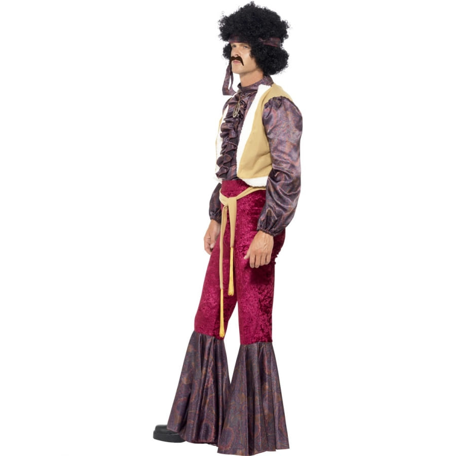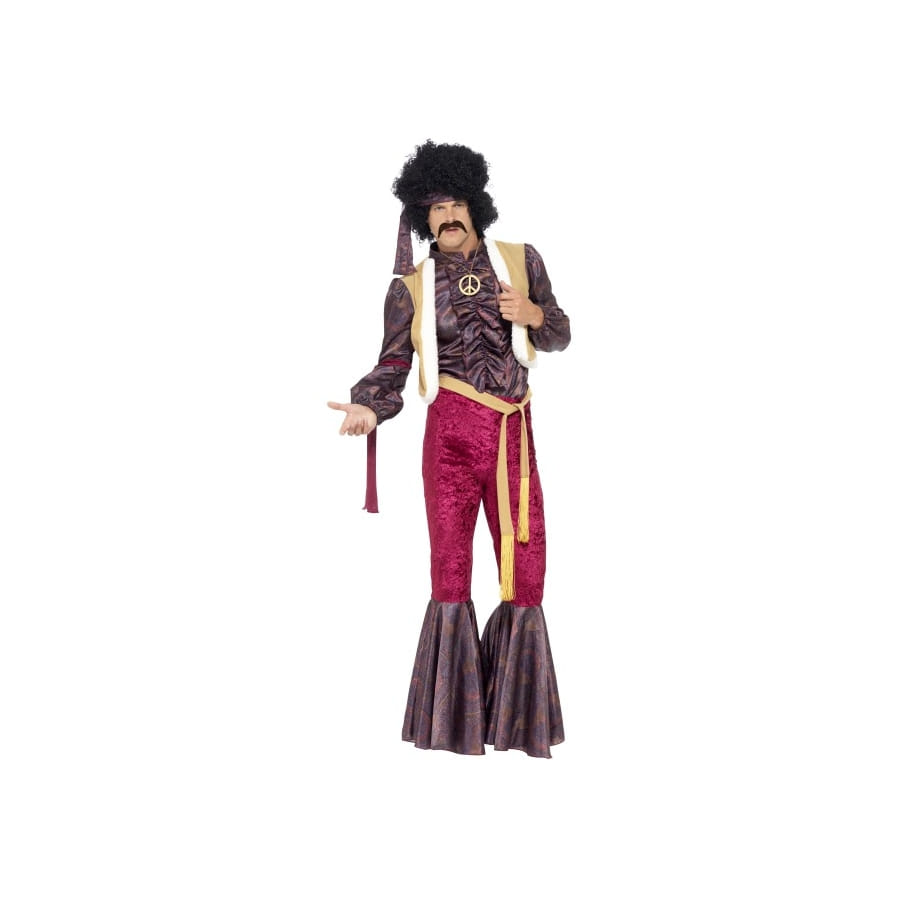 Si vous êtes du genre déjanté et que vous aimez partager la joie de vivre autour de vous, nous vous proposons le plus farfelu des déguisements : le costume de rockeur psychédélique des années 70, qui fera de vous le roi de la soirée. Ce costume est formé d'un pantalon de couleur rose, avec des pattes d'éléphant de couleur violette, de la même couleur que la chemise à froufrous qui va avec, et à laquelle est attaché un petit gilet de couleur marron. Il comporte aussi un foulard à cheveux, idéal pour les cheveux afro, de la même couleur que la chemise également. Soulignons que la perruque que vous voyez sur la photo n'est pas vendue avec le déguisement mais est disponible dans la catégorie perruque du site. Cet ensemble est disponible en tailles L, M et XL, uniquement pour homme.