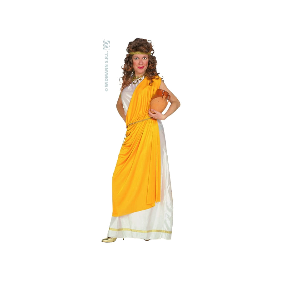 Set de déguisement d'Antiquité, pour femme, composé d'une toge jaune, d'une robe blanche, d'une ceinture dorée, d'un bracelet et d'un serre-tête doré, Cet ensemble est parfait pour une soirée romaine ou grecque.