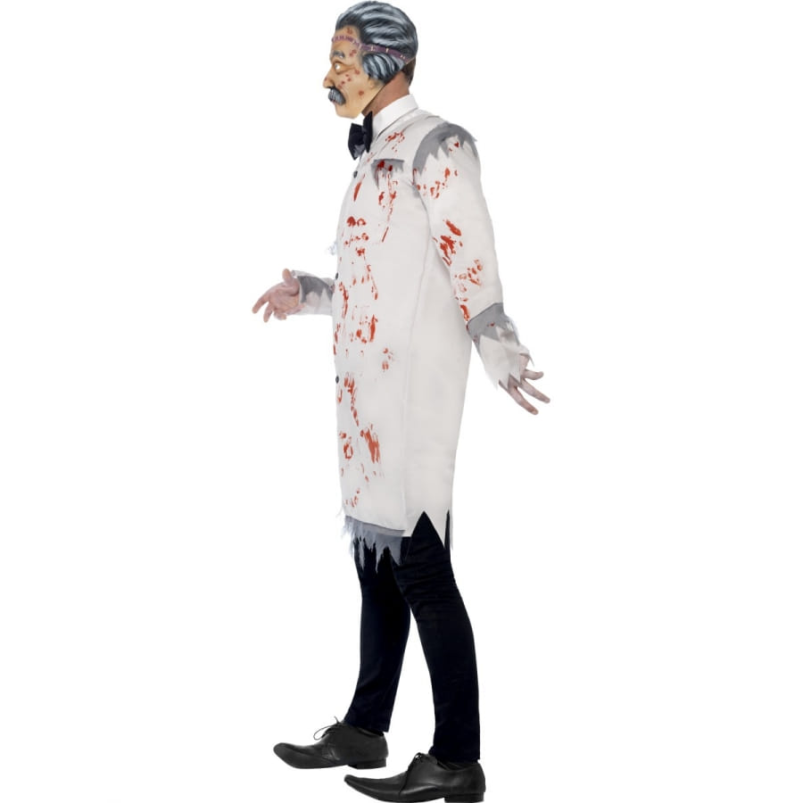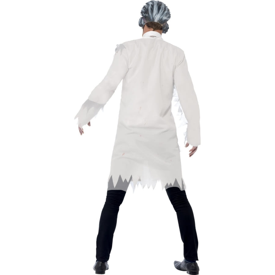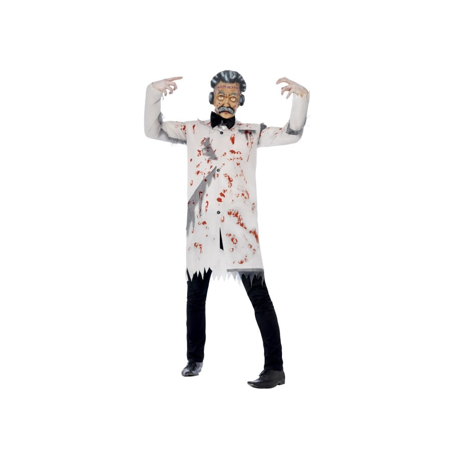 Qu'il est affreux ce déguisement ! Et c'est parfait, car il est destiné à être utilisé pendant la soirée si terrifiante d'Halloween. C'est un costume de savant génie zombie, pour hommes, composé d'une blouse blanche de labo, qui semble très usée, en lambeaux vers le bas et avec des taches de sang partout, d'un noeud papillon de couleur noire et d'un masque en latex, sous forme d'une tête de vieux savant fou. Il est disponible pour les hommes de tailles L et M. Avec cette tenue, vous aurez totalement l'air d'un génie zombie super dingue, qui veut détruire le monde avec ses potions chimiques. Nous vous conseillons de ne pas rater cette opportunité.
