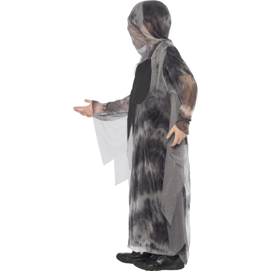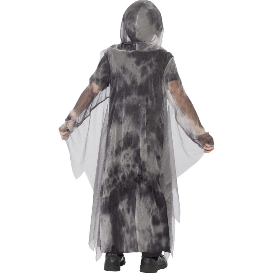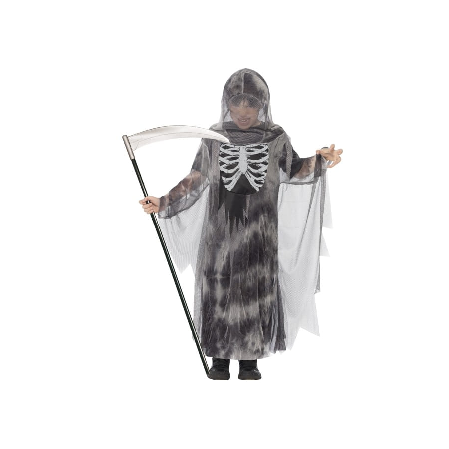Cette effrayante tenue se compose d'une robe longue avec capuche intégrée. Elle est de couleur grise et possède des manches longues. La capuche couvre toute la partie de la tête, mais en tissu filet au niveau du visage. La robe représente les os de la cage thoracique humaine au niveau de la poitrine. Ce déguisement est dédié aux petits garçons dont les tailles sont : 13/14 ans, 10/12 ans, 7/9 ans, 4/6 ans. Il sera idéal pour incarner le seigneur des fantômes tueurs pendant Halloween et effrayer les passants. Vous pourrez compléter le costume avec un faux de la mort ou un couteau, en plastique ou en mousse, bien sûr, pour ne pas causer de danger aux enfants.