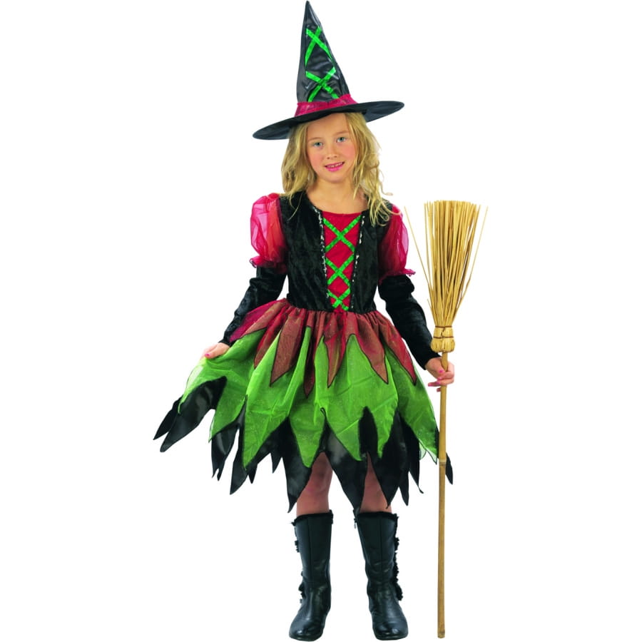 Set de déguisement d'Halloween, pour fille, composé d'une robe et d'un chapeau. Cet ensemble noir, rouge et vert est disponible pour enfants de 4 à 6 ans. Il est parfait pour déguiser votre fille en jolie petite sorcière pour Halloween.