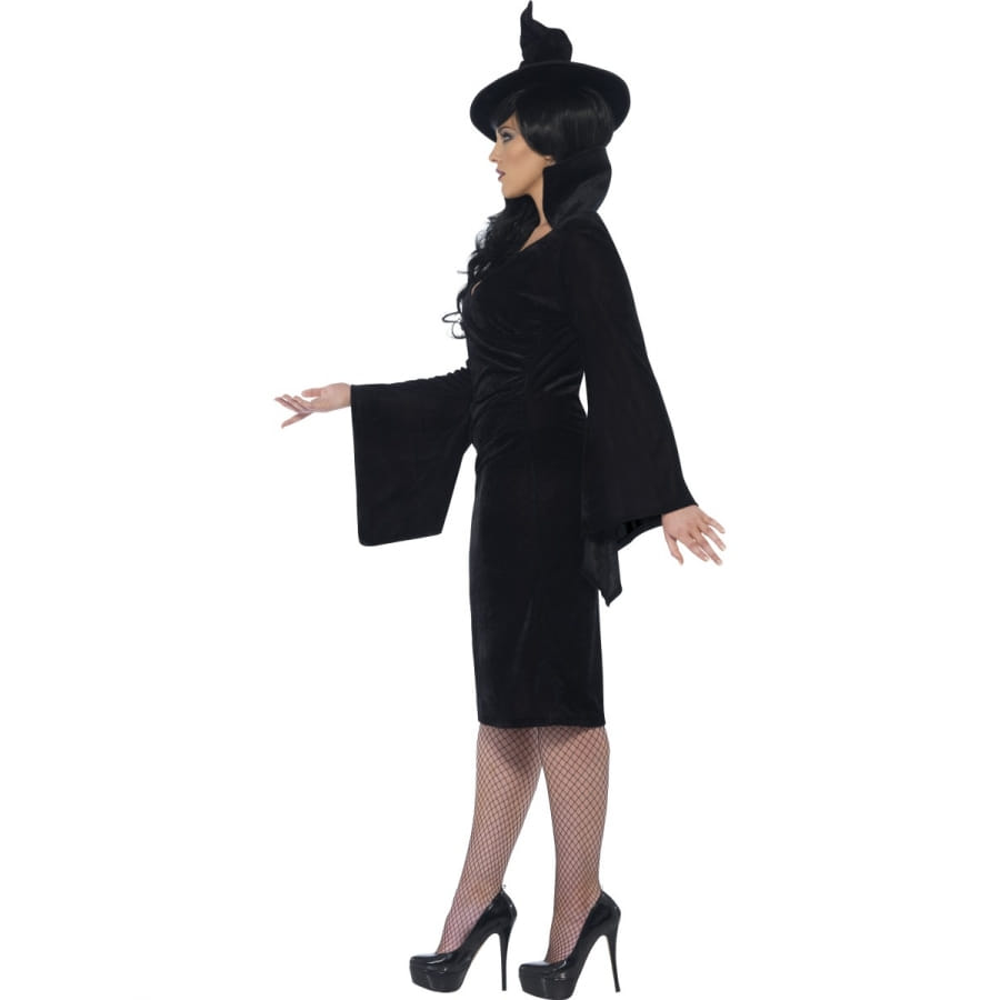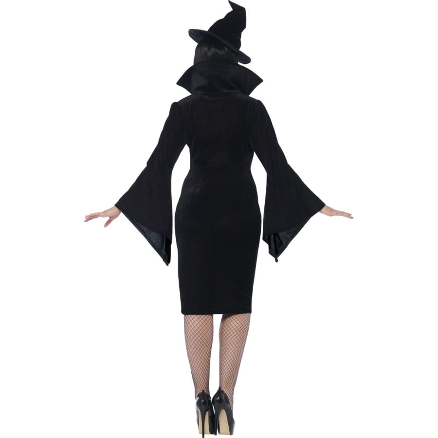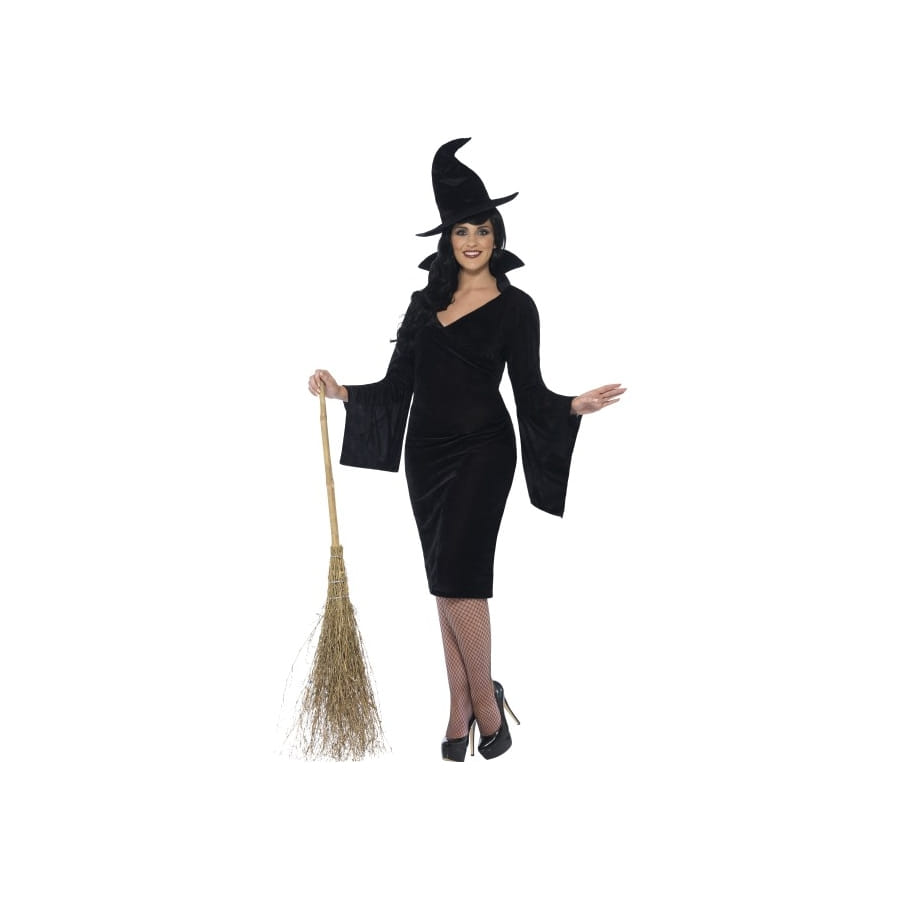 Nous vous proposons ce splendide déguisement pour que vous puissiez fêter une Halloween mémorable. C'est un costume de sorcière tout noir, composé d'une robe mi-longue décolletée, à col montant et à manches pagodes (évasées vers le poignet), et d'un beau chapeau de sorcière. Il convient aux femmes de grande tailles : L/ XL/ XXL/ XXXL. Accessoirisez le tout avec des chaussures à talons, un maquillage de style gothique, une perruque noire si vos cheveux ne le sont pas, sans oublier l'accessoire indispensable de toute sorcière qui se mérite de l'être : un bon vieux balai ! Soyez à la fois la plus méchante et la plus séduisante des sorcières !