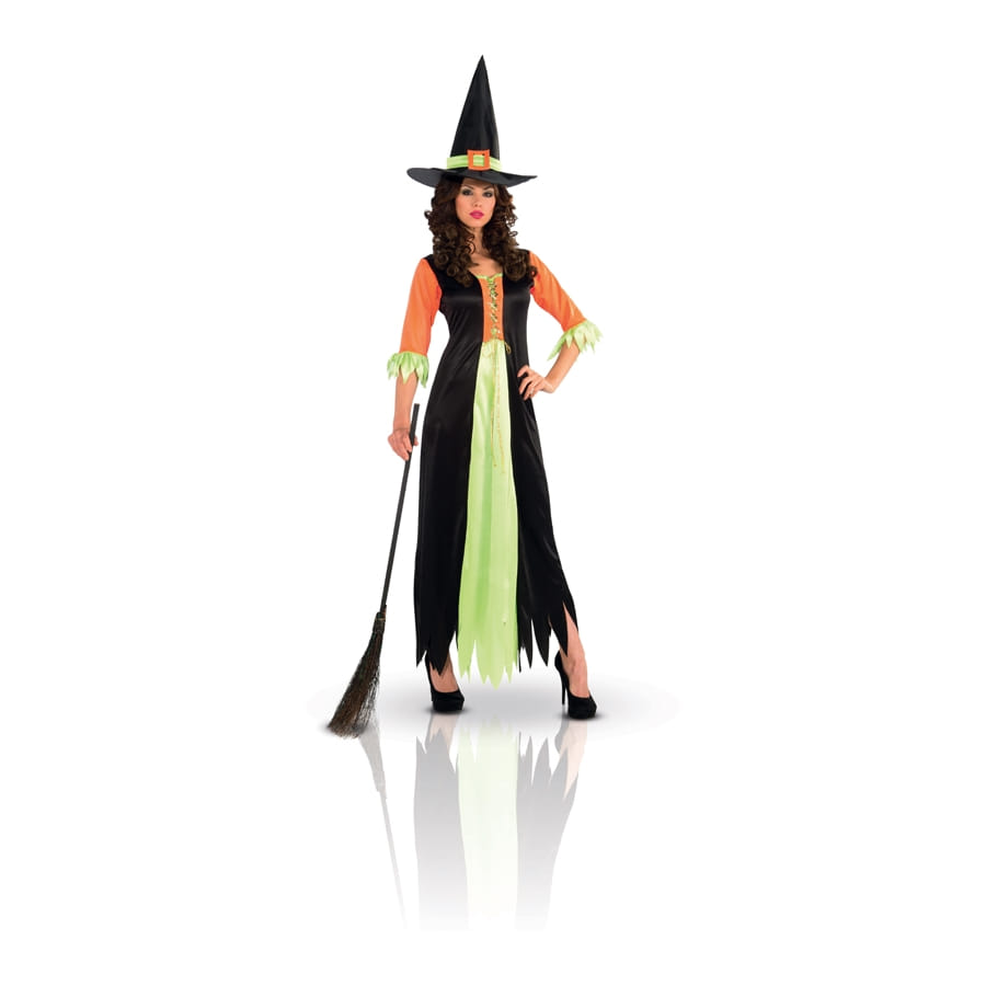 Avez-vous déjà un plan bien élaboré pour fêter Halloween entre amis? C'est une très bonne idée ! Sachez que ce splendide déguisement de sorcière, une méchante sorcière, bien sûr, car c'est Halloween, est totalement à votre disposition pour égayer la fête. Il se compose d'une robe et d'un chapeau. La robe est longue, de couleur noire sur les deux côtés, verte pour le milieu de la jupe du bas et les rebords des manches, et orange pour le haut, à manches 3/4. Le chapeau, quant à lui, est un chapeau noir pointu de sorcière, avec une bande verte et une boucle orange. C'est un costume pour vous, Mesdames et Mesdemoiselles ! Il est très agréable à porter. En plus, ne trouvez-vous pas que les couleurs se marient à merveille ? Il ne reste plus que le balai et hop, en route vers une soirée d'Halloween réussie !