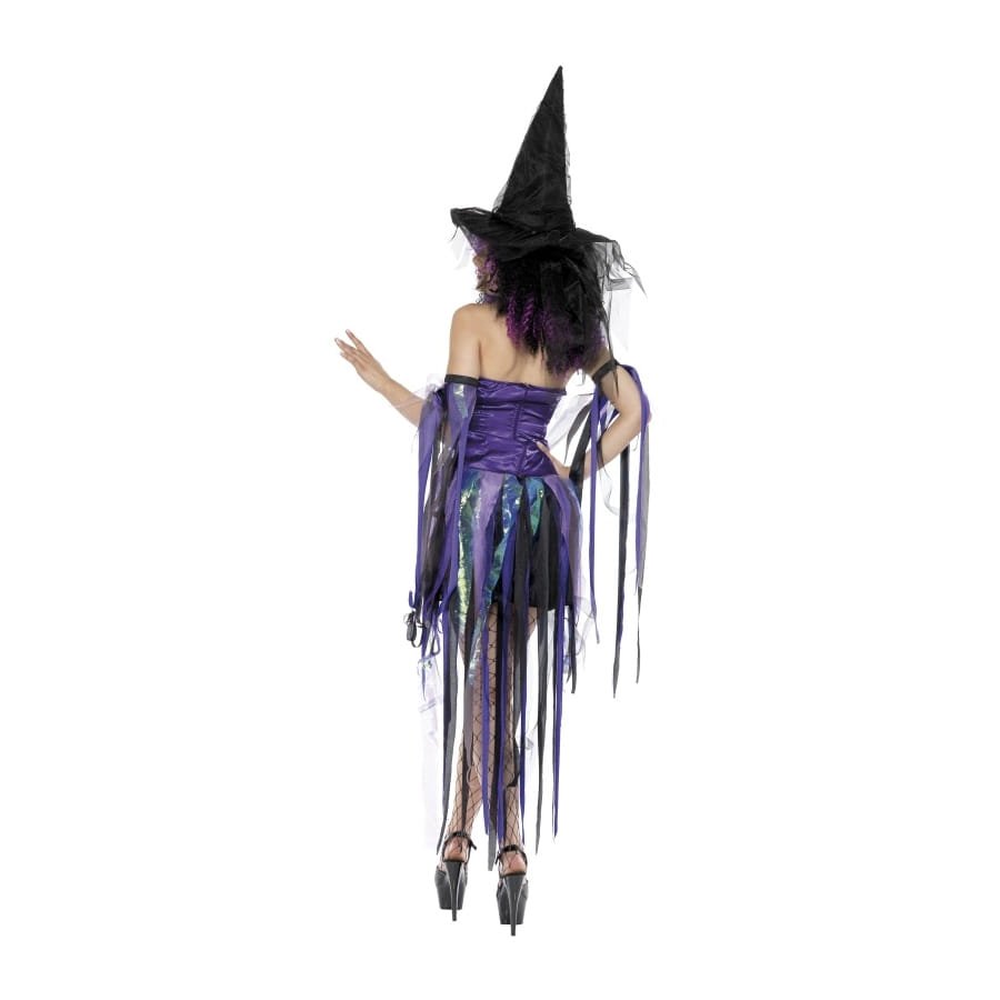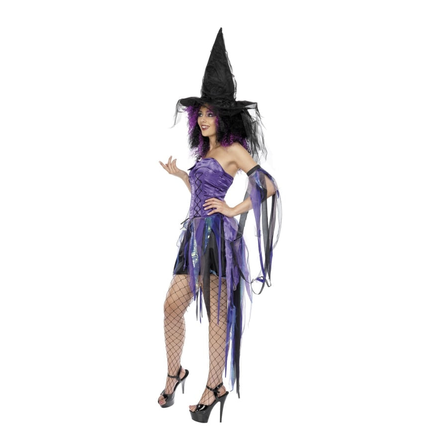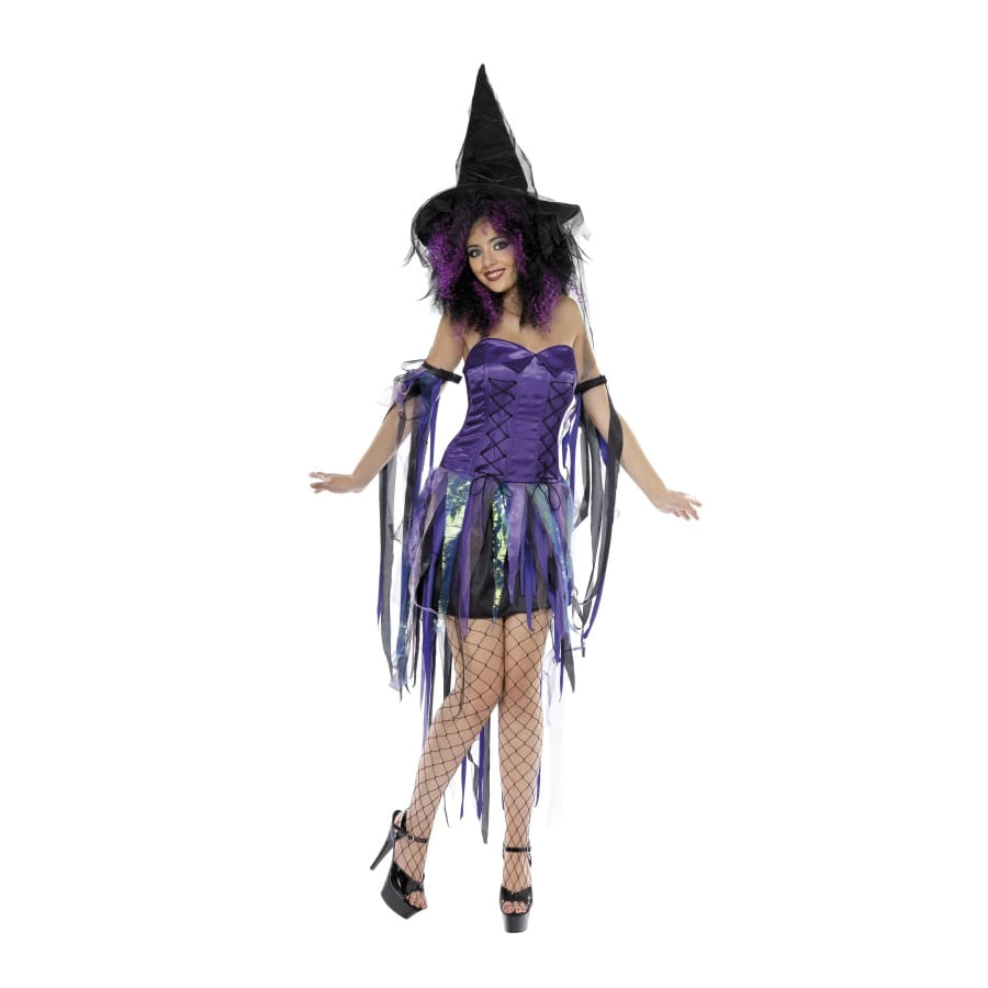 Déguisement de sorcièr de couleur argent, noire et mauve, pour femme, composé d'une robe, d'un chapeau et de manches. La robe et les manches sont ornées de franges violettes et noires, tandis que le jupon et le chapeau, qui est long et pointu, sont de couleur noire. La robe est disponible en taille S, M ou L. Elle donne un look de sorcière assez gai pour Halloween.
