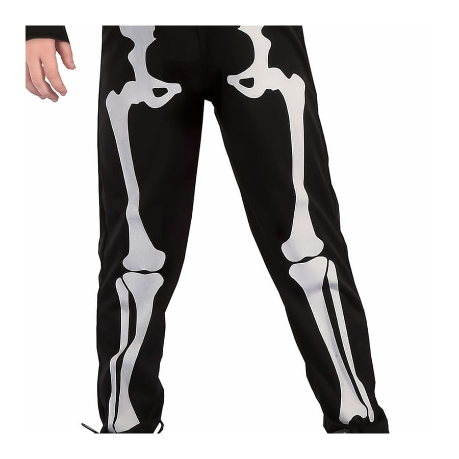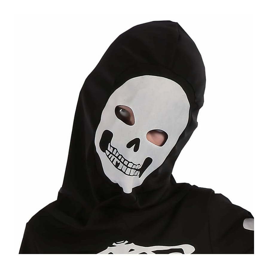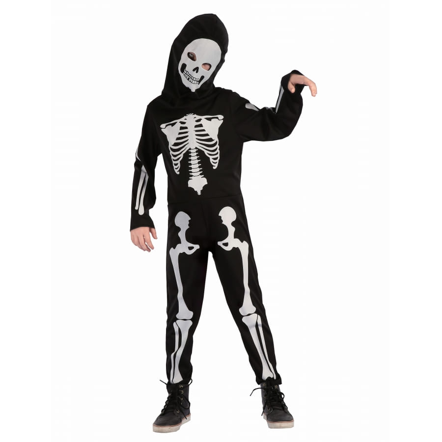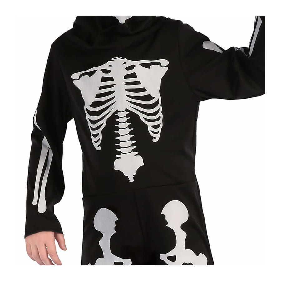 Imaginez votre enfant, sortant de l'ombre dans ce costume de squelette lors de la prochaine fête d'Halloween. Les voisins pourraient bien avoir la chair de poule! Et la cagoule? Ne vous inquiétez pas, elle est aussi noire que la nuit et ornée d'un crâne de squelette. Votre enfant pourra voir à travers les ouvertures pour les yeux et, en plus, il aura un look d'enfer!