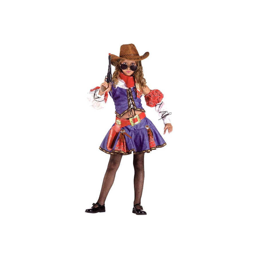 Les vilains méchants n'auront qu'à bien se tenir lorsque votre file portera son déguisement composé d'une jupe, d'un top, d'un foulard, de manchettes et d'un chapeau. Cet ensemble bleu, noir, doré et rouge est disponible en tailles 10, 12, 14 et 8 pour enfant de 10 ans. Il est parfait pour se transformer en Texas Girl.