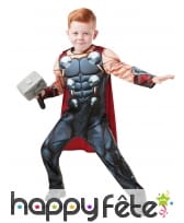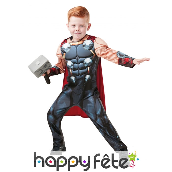 Regarder votre garçon s'émerveiller devant le superbe costume de Thor pour enfant avec marteau, à l'occasion d'une fête sur le thème des justiciers.