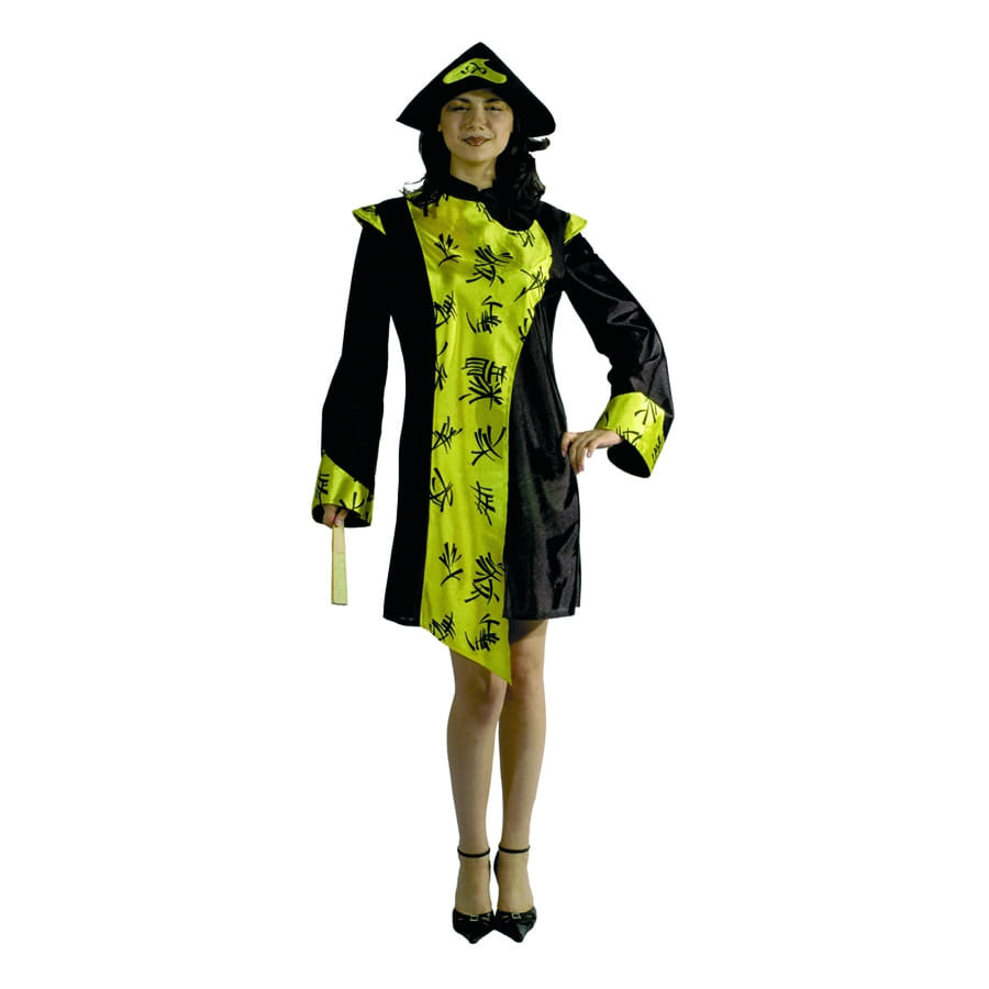Dans cet ensemble vous serez ravissante et méconnaissable, ce déguisement de tonkinoise soulignera votre féminité. Vous pourrez le porter si vous incarnez une danseuse ou même si vous aimez l'Asie. Existe en deux tailles:38/40 et 42/44. En jaune et noir, ce costume est composé d'une robe avec des manches longues, sur le devant de la robe il y a des motifs des écritures chinoises, il est aussi composé d'une coiffe.