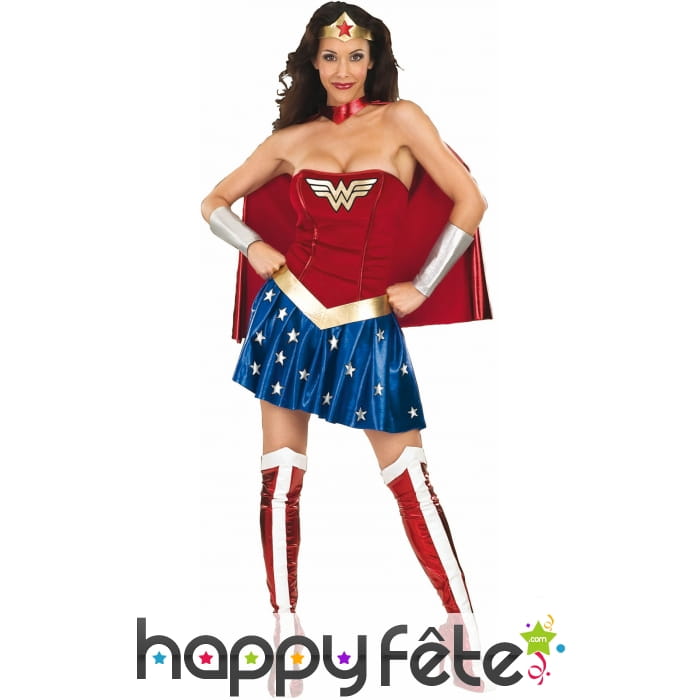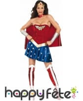 Déguisement de super héros sous licence, pour femme, composé d'une robe courte, d'une cape, d'une tiare, d'une paire de manchettes et de surbottes. Cet ensemble argent, blanc, bleu, doré et rouge est disponible en taille XS, S ou M. C'est la réplique parfaite du déguisement de Wonder Woman!