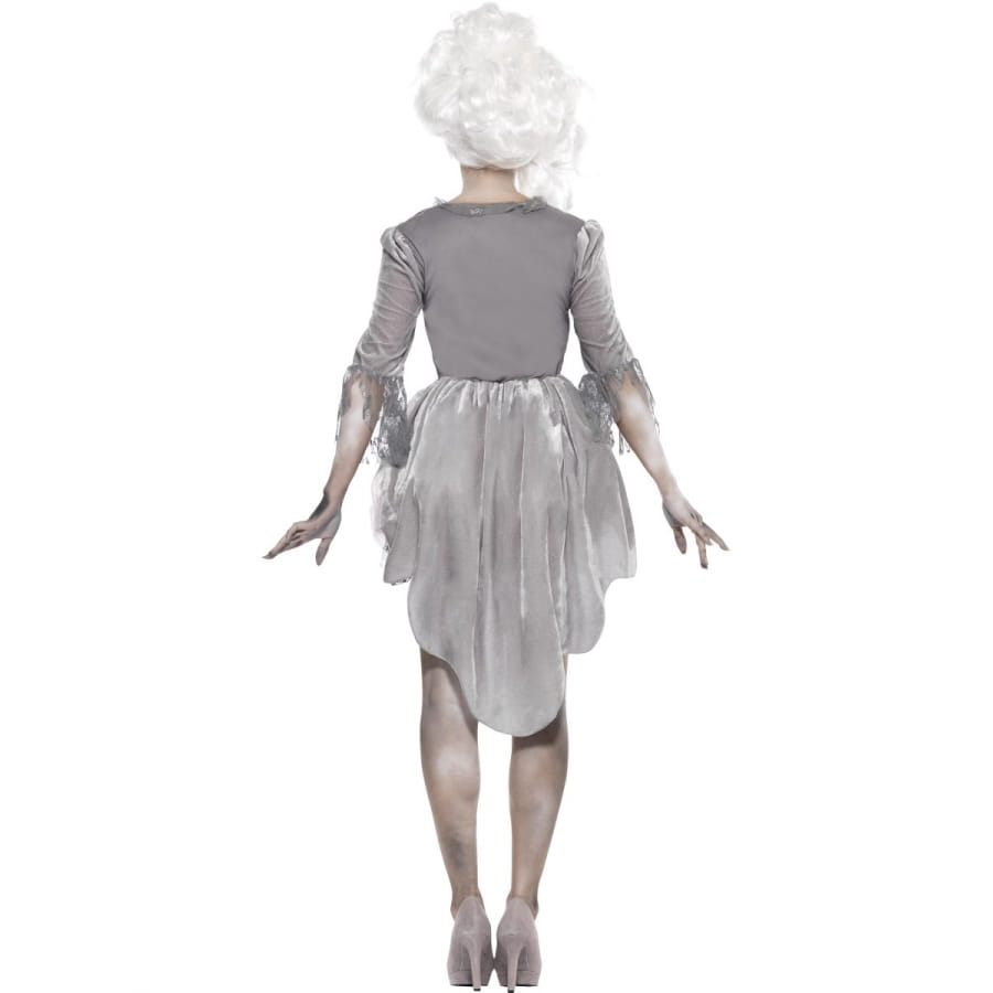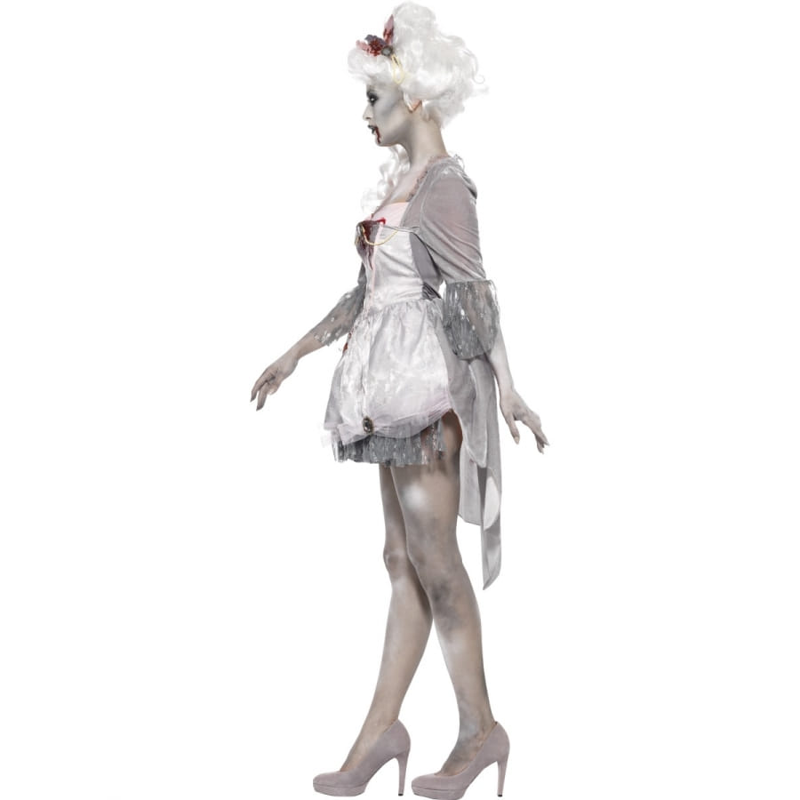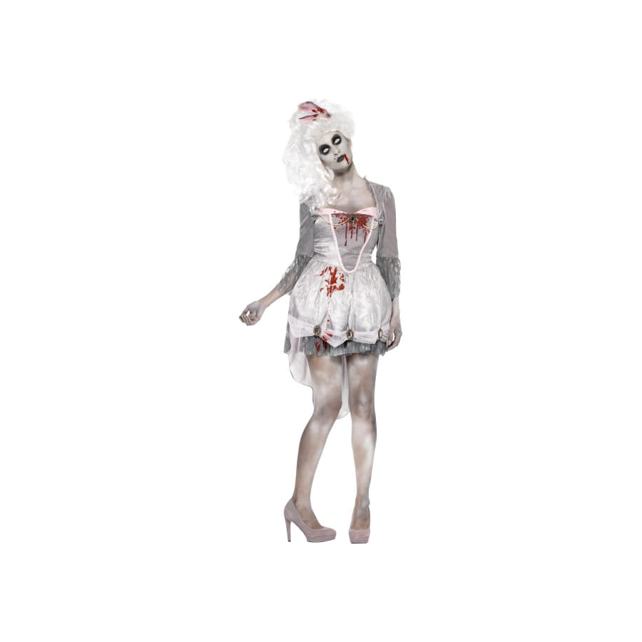 Si vous voulez vous déguiser en zombie cette année lors des fêtes d'Halloween, optez pour un costume de zombie assez original, pour que vous ne trouviez personne avec le même costume que vous. Nous avons alors ce déguisement de zombie géorgien pour femme à vous proposer. Il met en avant une robe très courte, de couleur grise et blanche, tachée de rouge rappelant une coulée de sang sur la robe, ainsi qu'une jarretière et une coiffe. A vous de jouer avec votre maquillage pour parfaire le déguisement. Une perruque blanche également ne serait pas de refus, pour bien rester dans le style géorgien.