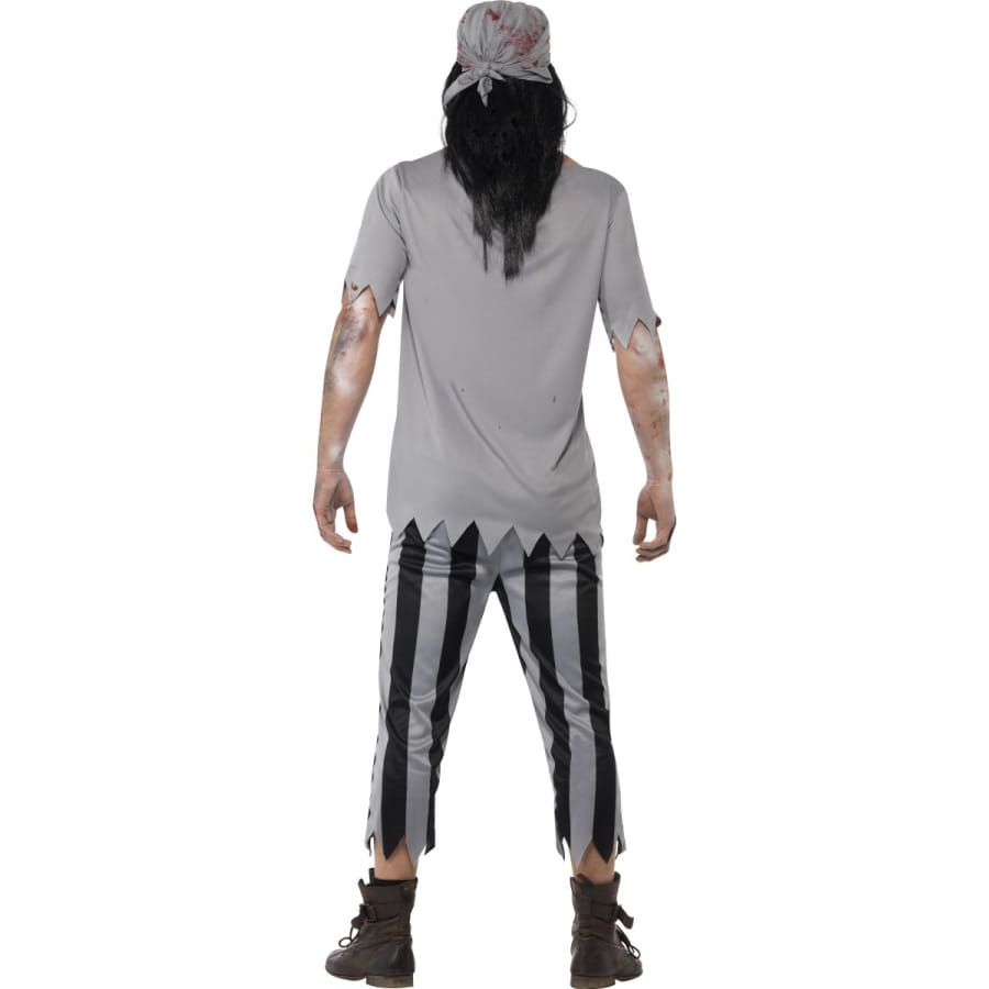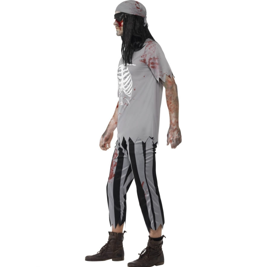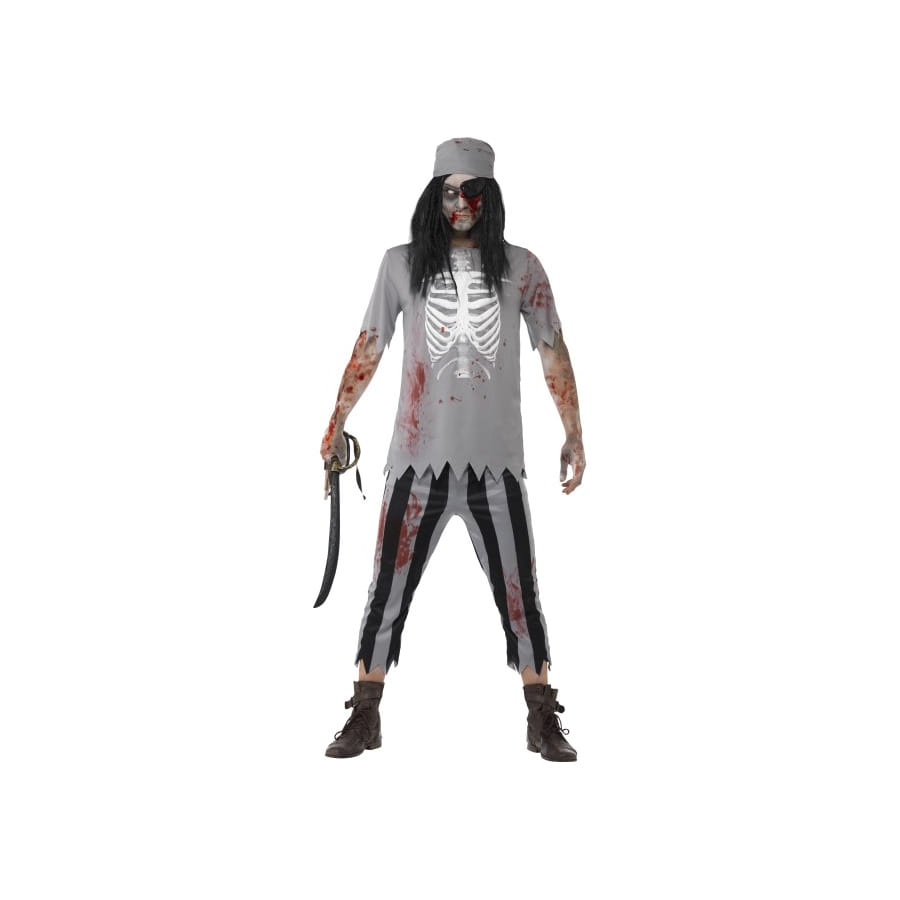 Déjà que les pirates sont des personnages assez spéciaux, mais transformés en zombie, ils donnent carrément la chair de poule. Jetez un oeil sur ce costume de zombie pirate pour homme et nous sommes sûrs que vous serez du même avis que nous. Pourtant, ce déguisement ne comprend qu'un haut de couleur grise, en lambeaux au niveau des bordures et imprimé en blanc sur la cage thoracique, un pantalon à rayures verticales grises et noires écourté par le fait que les bords ont été déchiquetés, un bandana gris également, ainsi qu'un cache-oeil de couleur noire. Le tout est proposé uniquement pour ces Messieurs.