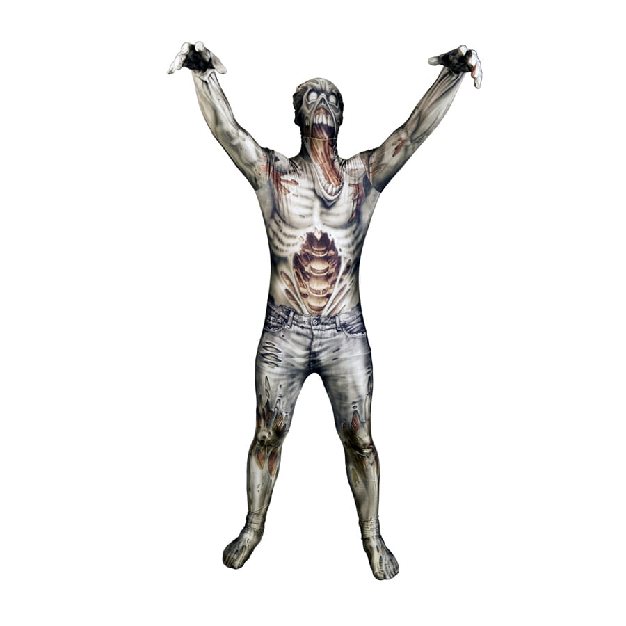 Voulez-vous incarner le personnage d'un film d'horreur devant vos proches et vos amis pour Halloween ? Ce déguisement de zombie seconde peau vous sera ainsi d'une grande utilité. Il se compose d'une combinaison qui couvre l'intégralité de votre corps, de la tête aux pieds. Cette combinaison est imprimée d'un zombie en colère qui ouvre grandement son énorme bouche, avec quelques os et des vêtements déchirés pour présenter un aspect vraiment répugnant et effrayant. Elle possède une fermeture éclair à l'arrière pour faciliter son utilisation. Ce costume est dédié aux hommes de tailles L et M. Alors, n'hésitez plus, il vous transformera à merveille en une bien sinistre et terrifiante créature.