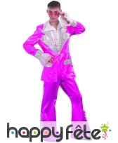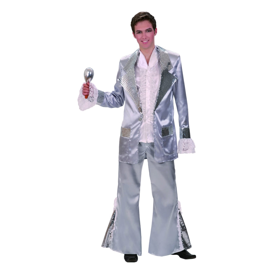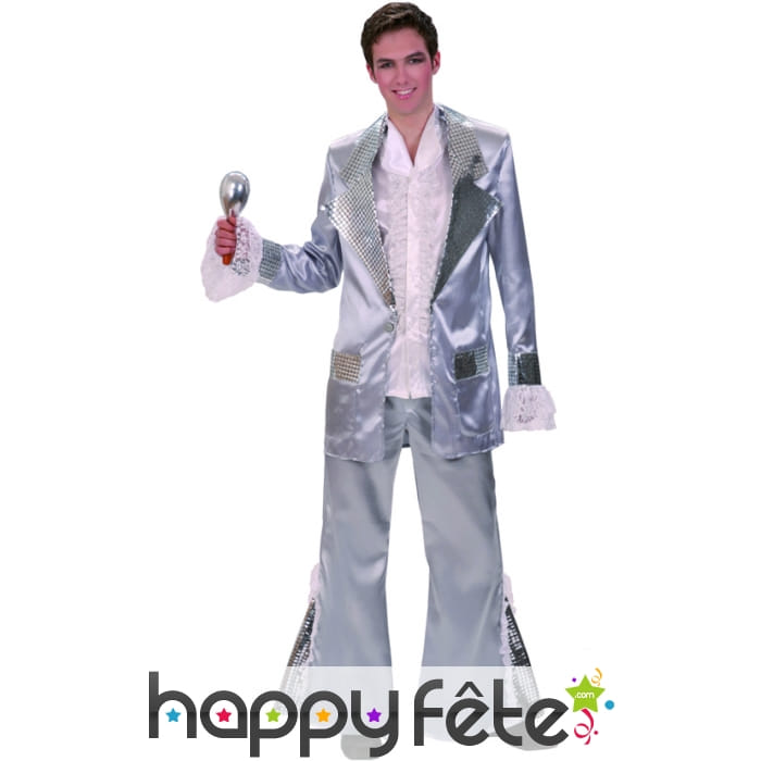 Le roi de la piste de danse sera vous dans ce costume disco king argent. Ce déguisement sur vous vous ne passerez pas inaperçus dans vos soirées disco ou même durant le carnaval. Ce costume argenté et blanc est composé d'un pantalon pattes d’éléphant, d'une chemise a ruches et d'une veste avec des paillettes.