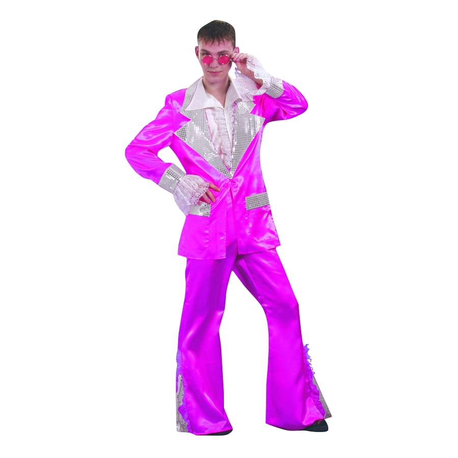 Avec ce costume sur vous, vous serez le roi de la soirée. Cette soirée disco est idéale pour vous revêtiez ce costume. Disponible en deux tailles:50/52 et 54/56 ce costume est composé d'un pantalon pattes d'éléphant, d'une chemise à ruches et d'une veste rehaussée. De couleur argent et rose ce déguisement vous mettra en valeur.