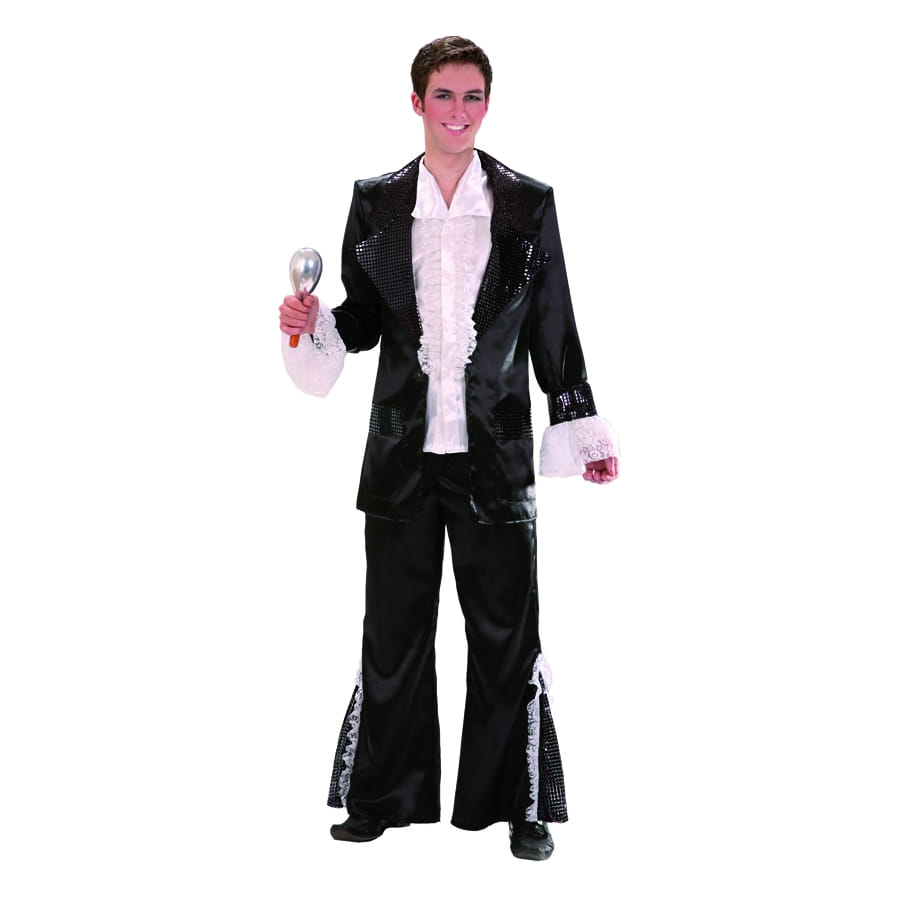 Vous serez sensationnel et tous les regards seront tournés vers vous dans ce costume de Disco king noir, si vous êtes fan des années 70 et fan de disco vous serez ravi. Vous pourrez également le porter durant une soirée paillettes ou même durant le carnaval. Le costume Licence Elvis Presley est disponible en deux tailles: 50/52 et 54/56. Il est composé d'un pantalon pattes d'éléphant, une chemise a ruches et d'une veste rehaussée à paillettes.