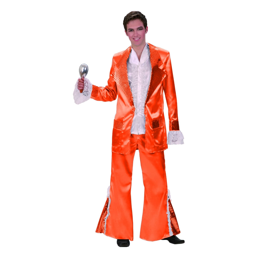 Vous serez sensationnel dans ce déguisement de disco king. Dans cet ensemble vous serez le danseur de la soirée disco ou autre soirée à thème. Cet ensemble au complet de bonne qualité qui fait en polyester satin et composé d'un pantalon à pattes d'éléphant, d'une chemise à ruches et d'une veste à paillettes. Disponible en deux tailles : 50/52 et 54/56.