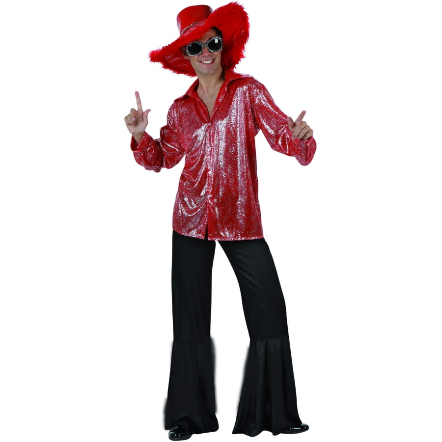 Retournez dans l'époque de la fièvre du samedi soir et des paillettes avec ce costume disco rouge brillant et argenté pour homme. Ce déguisement est composé d'une chemise à manches longues, de couleur rouge, avec des motifs argentés qui lui donnent un effet brillant, ainsi que d'un pantalon patte d'éléphant noir. Pour compléter la tenue, vous pouvez choisir de nombreux accessoires en fonction de votre convenance. Notre modèle, par exemple, porte un chapeau et une paire de lunettes flashy, que vous pourrez retrouver sur le site, de même que des bottes ou bijoux sur le même thème du Disco. Cette tenue convient à toutes les circonstances, notamment pour une soirée disco, rétro, ou un carnaval. Vous retrouverez ainsi l'ambiance des années 70-80 et enflammerez la piste de danse !