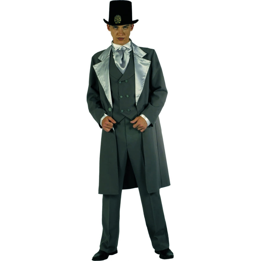 Set d'Halloween, pour homme, composé d'un plastron, d'un gilet, d'une veste à revers satiné, d'un pantalon et d'un foulard satiné. Cet ensemble gris est disponible en taille 50/52 ou 54/56. Il est parfait pour se déguiser en compte Vlad Dracula.