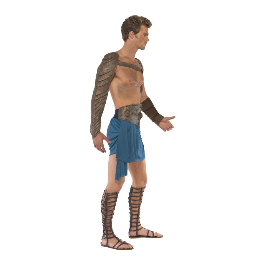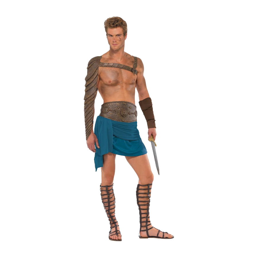 Soyez le plus courageux des hommes avec ce costume composé d'une jupe bleue, d'une armure, d'une ceinture et d'un couvre-bras marron. Cet ensemble est disponible en taille M. Il est idéal pour se transformer en Spartacus ou tout autre guerrier romain ou grec.