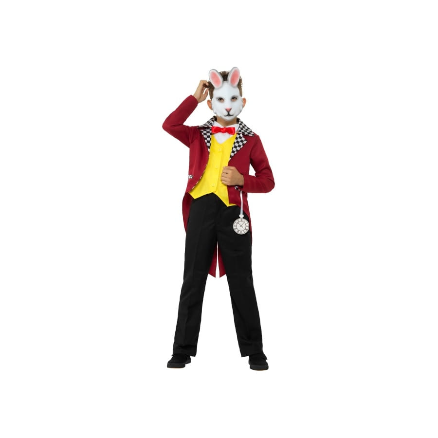 « En retard, toujours en retard » répète le Lapin blanc ! Toujours occupé à courir, ce personnage est l'un des plus célèbres de l'histoire d'Alice au pays des merveilles. Glissez-vous dans sa peau en commandant le costume du lapin blanc d'Alice pour enfant. Il s'agit d'un ensemble de vêtements et d'accessoires inspirés du look du Lapin blanc. Vous aurez donc droit à une veste rouge à queue-de-pie avec gilet jaune intégré. Le col présente des motifs damiers noirs et blancs. Un petit noeud papillon rouge s'ajoute au costume pour plus d'élégance ! Pour parfaire le déguisement, vous disposerez d'un masque facial Lapin blanc. Équipé de deux ouvertures pour les yeux, il couvre uniquement la face avant du visage. Costume prévu en différentes tailles pour les 4 à 12 ans.