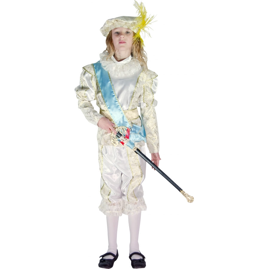 Dans ce déguisement du petit prince Alexandre votre fils sera tout fière. Un costume très élégant, tout le monde lui fera la révérence dans ce costume du petit prince Alexandre. Il est composé d'une tunique blanche avec bordures dorées avec baudrier bleu, d'un pantalon blanc qui arrive jusqu'aux genoux et d'une coiffe avec plume.