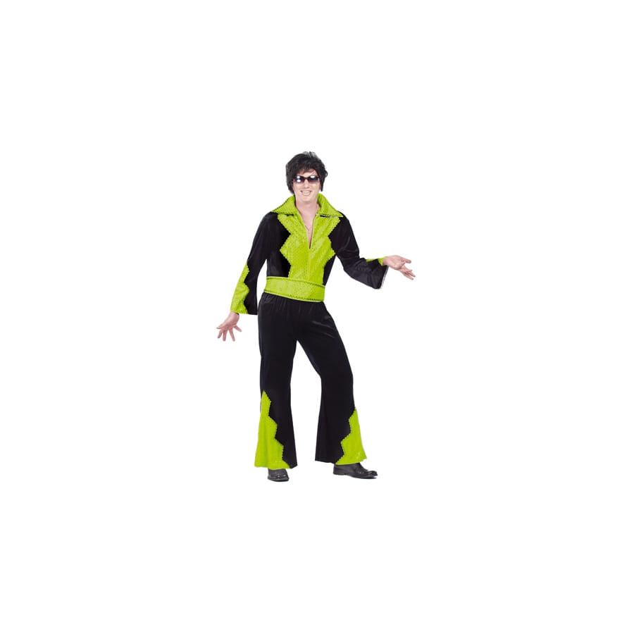 Ce costume d'Elvis est proposé sous forme de combinaison (composée du haut, du bas ainsi que de la ceinture verte). Le pantalon patte d'eph noir est décoré de vert anis dans le bas. Le haut à grand col reprend également les deux couleurs du pantalon avec des zones noires et d'autres vertes. La large ceinture fait également partie du déguisement. Notre conseil pour accessoiriser ce déguisement : une paire de lunette de rocker et pourquoi pas une perruque banane dans le plus pure style année 70.