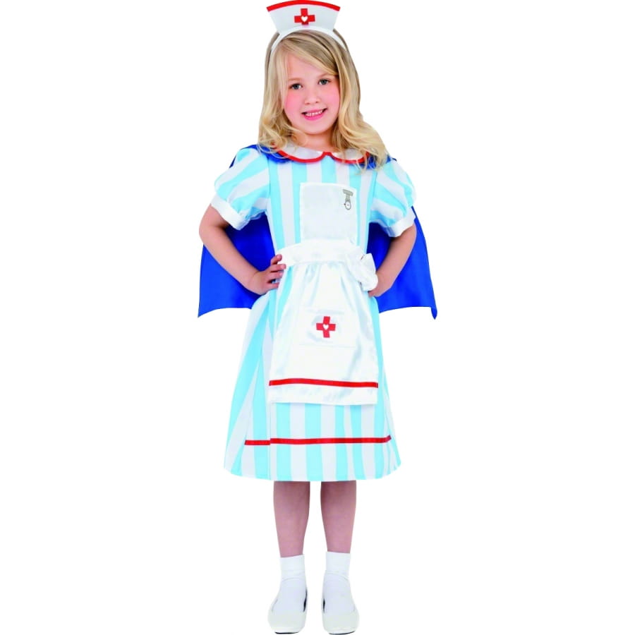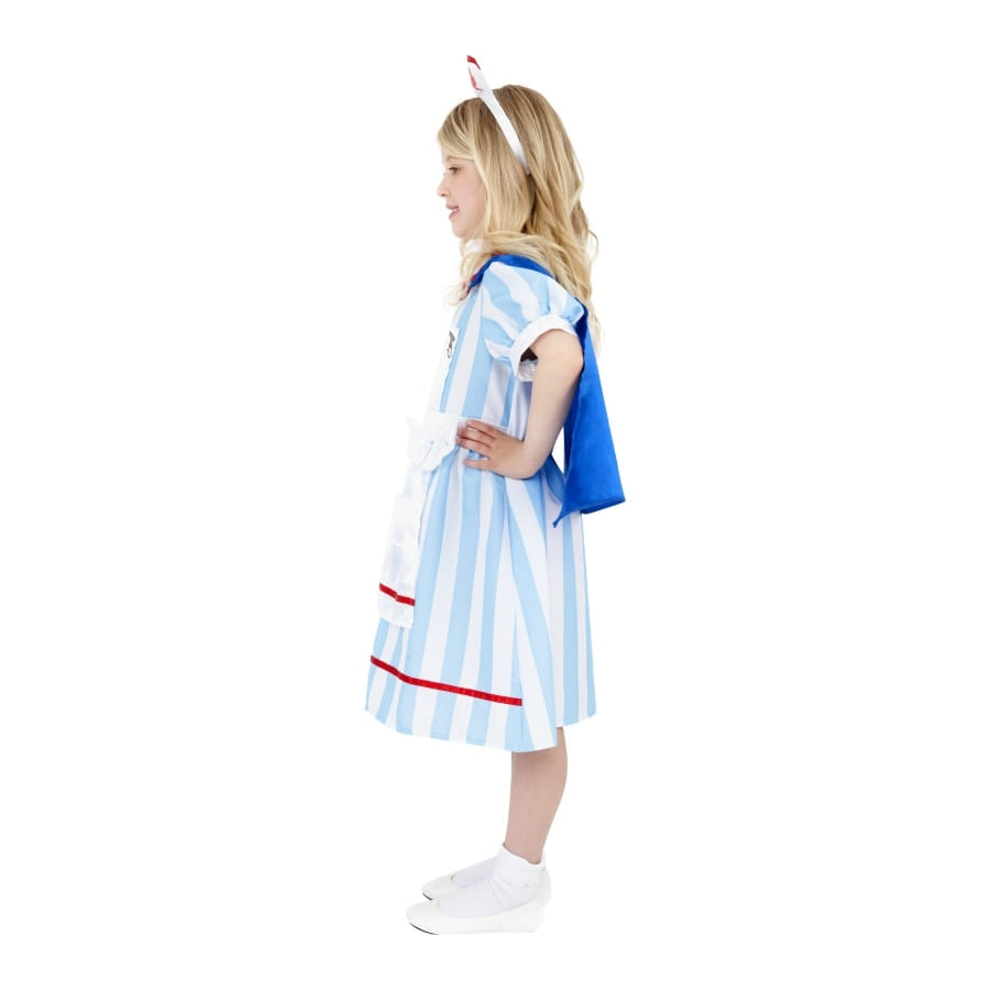 Votre fille soignera bien les bobos avec cette cape, la coiffe et la robe avec tablier blanc, bleu et rouge. Cet ensemble est disponible en tailles M et S et est idéal pour une fille entre 7 et 9 ans. Il est parfait pour un carnaval ou un anniversaire.