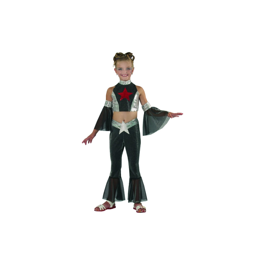 Costume de starlette pour enfant de très bonne qualité composé d'un top argent et noir avec étoile rouge pailletée, d'un pantalon avec volants noir et ceinture pailletée à étoile assortie et d'une paire de manchettes noires avec rebords argent. Cet ensemble est disponible en taille 104, 116, 128, 140, 152 et 164. Vous ne pourrez choisir ni le modèle ni la couleur lors de la commande. Vous recevrez le déguisement comme présenté.