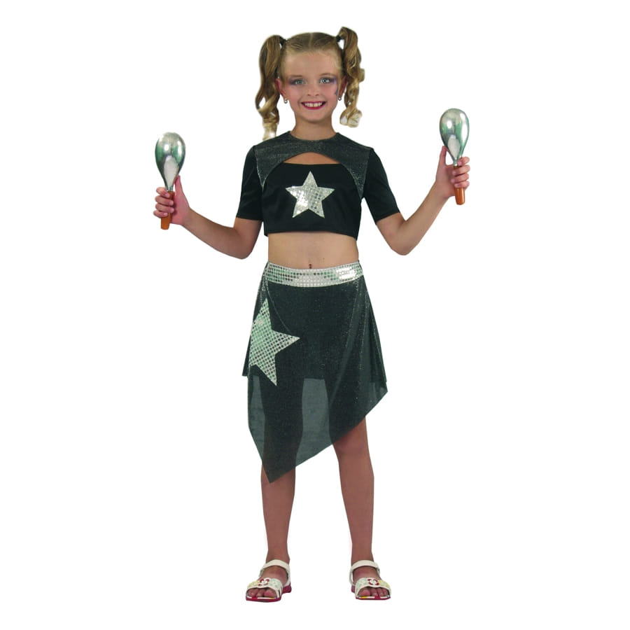 Dans ce déguisement elle sera une petite danseuse hors pair. Ce déguisement lui apportera du succès, elle pourra le mettre pour le carnaval ou même un spectacle de danse. Ce costume est un ensemble qui est composé d'un top avec manche et une étoile sur le devant ainsi qu'une jupe avec ceinture argentée et une étoile sur le coté.