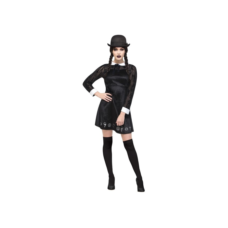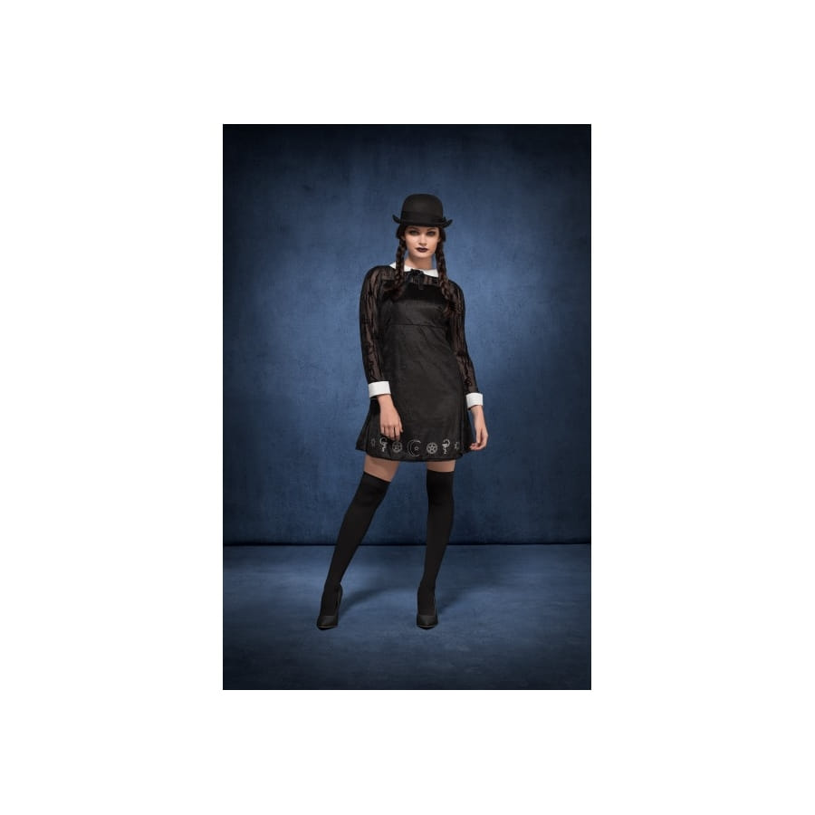 Le style gothique, relatif à halloween, se marie parfaitement à la séduction durant cette fête. Aussi, nous vous invitons, mesdames, à essayer le costume étudiante gothique sexy pour adulte. Cette tenue reste disponible sur notre site happyfete. Il s'agit d'une petite robe noire, à manches longue, conçue dans un tissu à effet velours. Vous retrouverez sur les bords des motifs occultes pour rappeler le côté mystique d'halloween. Vous pouvez associer à ce costume étudiante gothique sexy pour adulte, un rosaire gothique noir et rouge visible sur happyfete. Si vous préférez les bracelets, nous vous conseillons aussi le bracelet bague gothique.