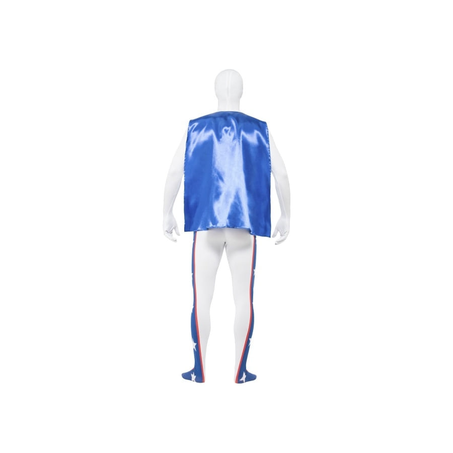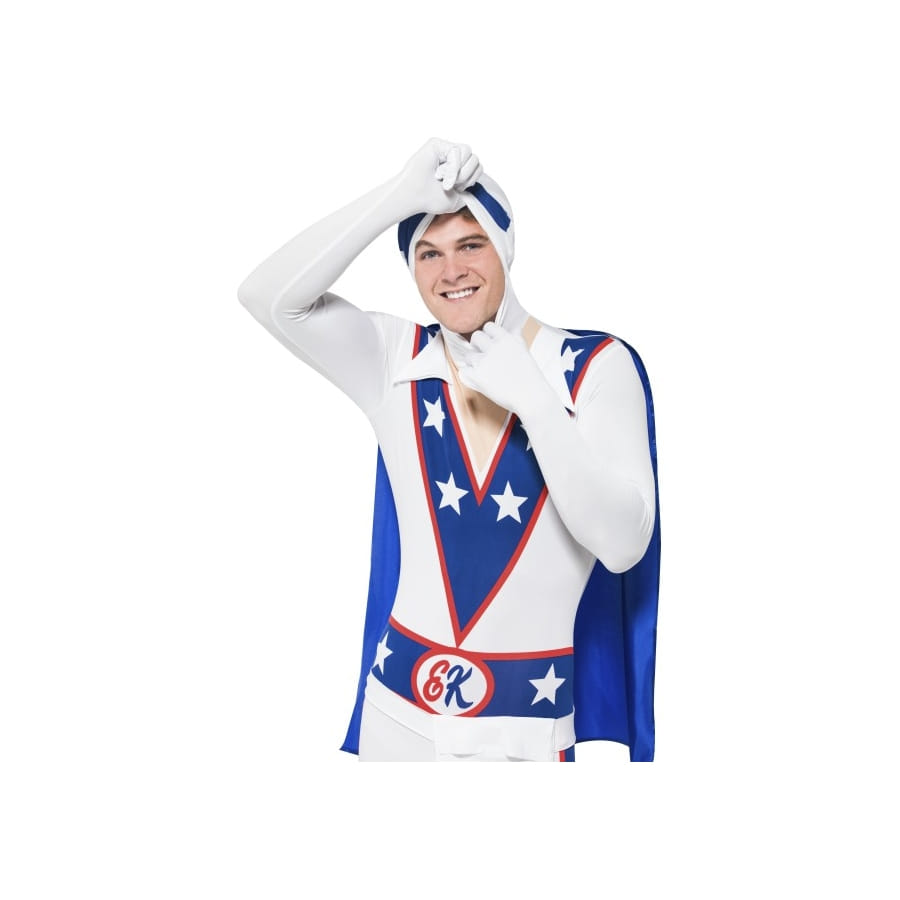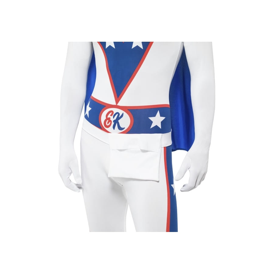Inspiré du célèbre cascadeur américain Evil Knievel, ce costume Evil Knievel seconde peau est parfait pour faire de vous la grande star lors d'un évènement particulier. Le costume est destiné aux hommes, très pratique pour bouger car c'est une combinaison moulante. Il est composé d'une combinaison tout en un avec l'initial EK au niveau de la ceinture, un cagoule ouvrable à la tête et une belle cape bleue au dos (contient également une petite sacoche vous permettant de transporter quelques affaires). Le blanc et le bleu sont les couleurs de base de ce costume avec une petite touche de rouge. Il est important de souligner que l'inscription de lavage est : nettoyage à sec uniquement. Le modèle de costume de taille L correspond à un tour de poitrine de 106 - 110 cm, entrejambe 83,8 cm et le modèle de taille M correspond à un tour de poitrine de 96 - 101 cm, entrejambe 83 cm.