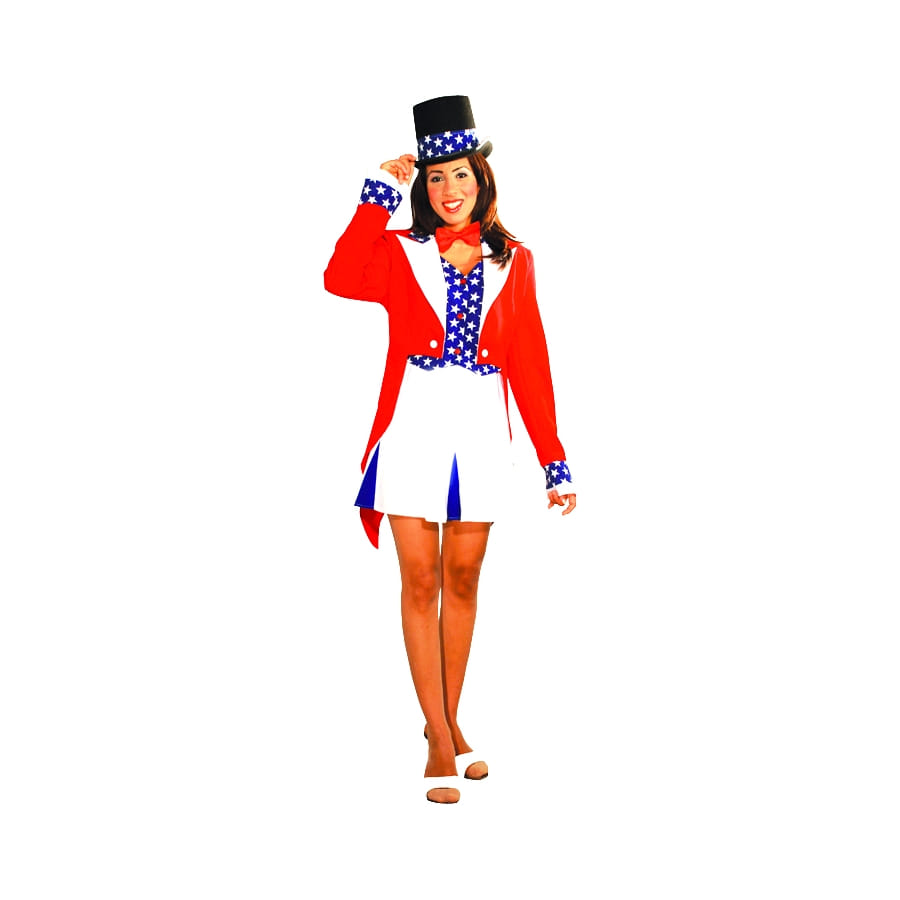 Madame métamorphosez-vous en star America pour une journée. Vous serez ravissante et même resplendissante durant cette fête. Vous serez transformée grâce à ce déguisement. Il est composé d'un frac rouge avec un col blanc, d'un plastron, un nœud papillon rouge, un bandeau pour chapeau avec des motifs dessus et une jupe blanc et bleu. Il est disponible en 38/40 et 42/44.