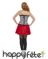 Le corset est à rayures blanches et noires avec un laçage noir dans le dos.