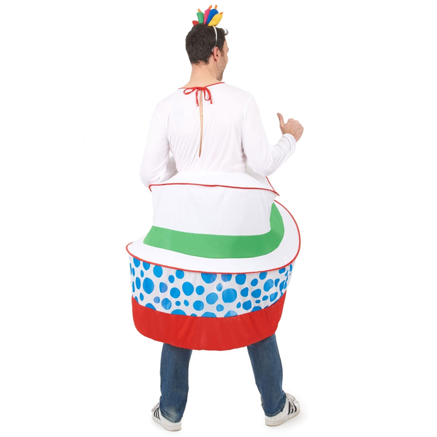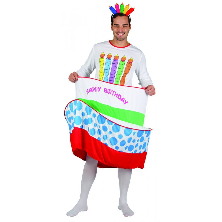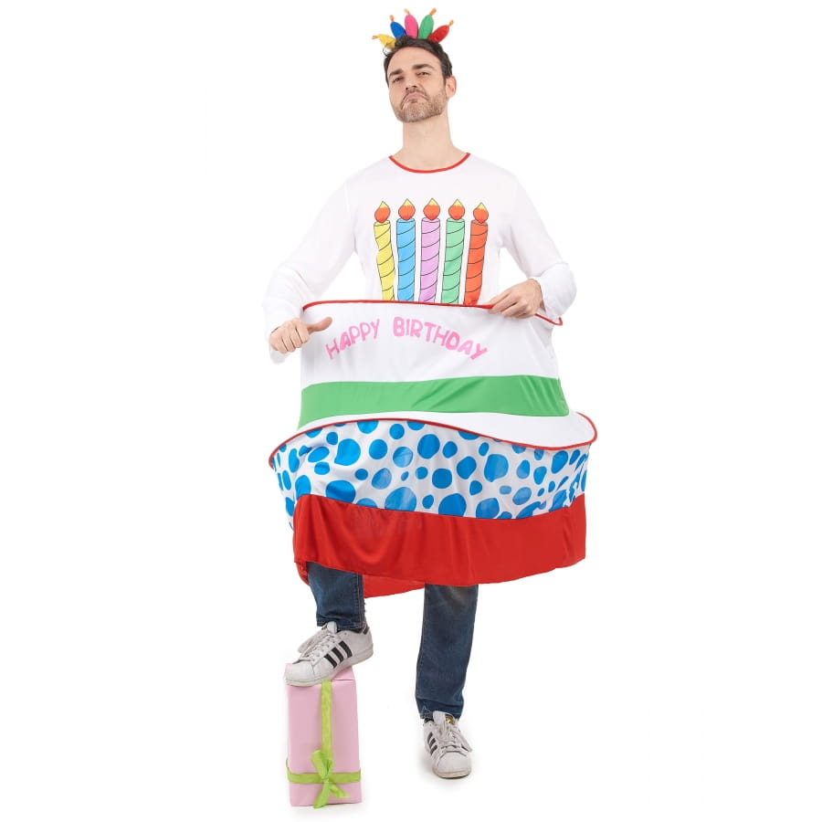 Portez ce costume gâteau d'anniversaire pour homme le jour de votre anniversaire, vous allez amuser la galerie et mettre de l'ambiance à la fête. Il se compose d'une combinaison dont le haut est fait d'un sweat-shirt blanc à manches longues, avec un col rond à liseré rouge, imprimé sur le devant par des bougies multicolores. Cette combinaison est élastique à la taille, et elle dispose de deux cerceaux permettant de déterminer les niveaux du gâteau. Nous avons un gâteau à trois niveaux. Le premier est constitué du haut de la tenue, le deuxième est en tissu blanc avec l'inscription "Happy Birthday", et une bande verte la sépare du dernier niveau. Ce dernier niveau est en tissu blanc imprimé bleu et se termine en bas par une bande épaisse rouge. Les cerceaux sont marqués de liserés rouge comme le col. Pour finaliser la tenue, un serre-tête garni de cinq bougies rembourrées multicolores se met sur la tête.