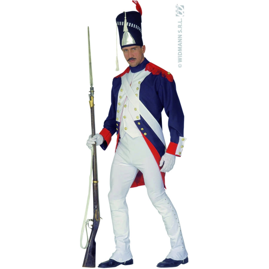 Costume de grenadier composé d'un pantalon, d'un chapeau, d'une veste avec plastron et d'une paire de surbottes. Cet ensemble blanc, bleu, rouge et noir est disponible en taille S, M ou L. Il est parfait pour se déguiser en grenadier.