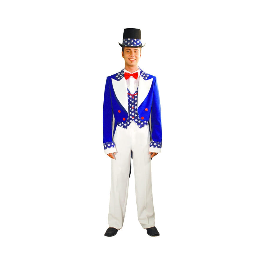 Déguisez-vous en star America messieurs, portez fièrement les couleurs de l'Amérique dans ce costume. Pour le carnaval ou tout simplement une fête ayant pour thème l'Amérique. Ce déguisement est de très bonne qualité. Un costume sensationnel pour une journée ou une soirée exceptionnel vous serez ravi. Il existe en taille 50/52 et 54/56. Cet ensemble comporte un frac bleu avec col blanc et des boutons rouges, un gilet avec des étoiles blanches dessus , un bandeau pour chapeau avec des étoiles dessus et un nœud papillon.