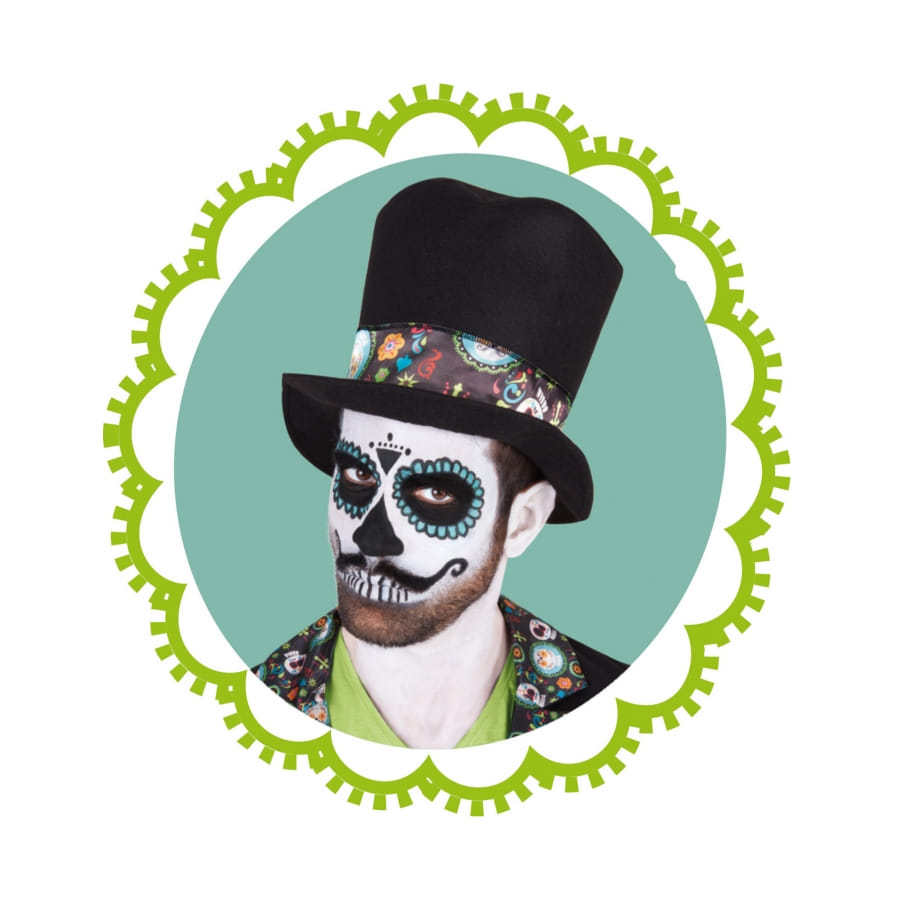 Le couvre-chef en feutrine est décoré, à la base, de têtes de mort colorées sur une bande de tissu coloris noir.