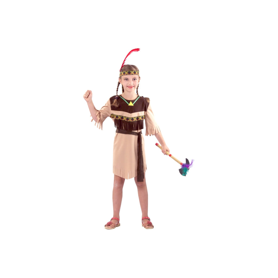 Déguisement parfait pour transformer votre fillette en une Pocahontas des temps modernes, formée d'une robe de couleur beige et marron avec des franges, d'une ceinture et d'un bandeau. Complétez le déguisement par un petit collier de style indien, une petite plume sur la tête et éventuellement un tomahawk. Tenue proposée en taille 104 cm