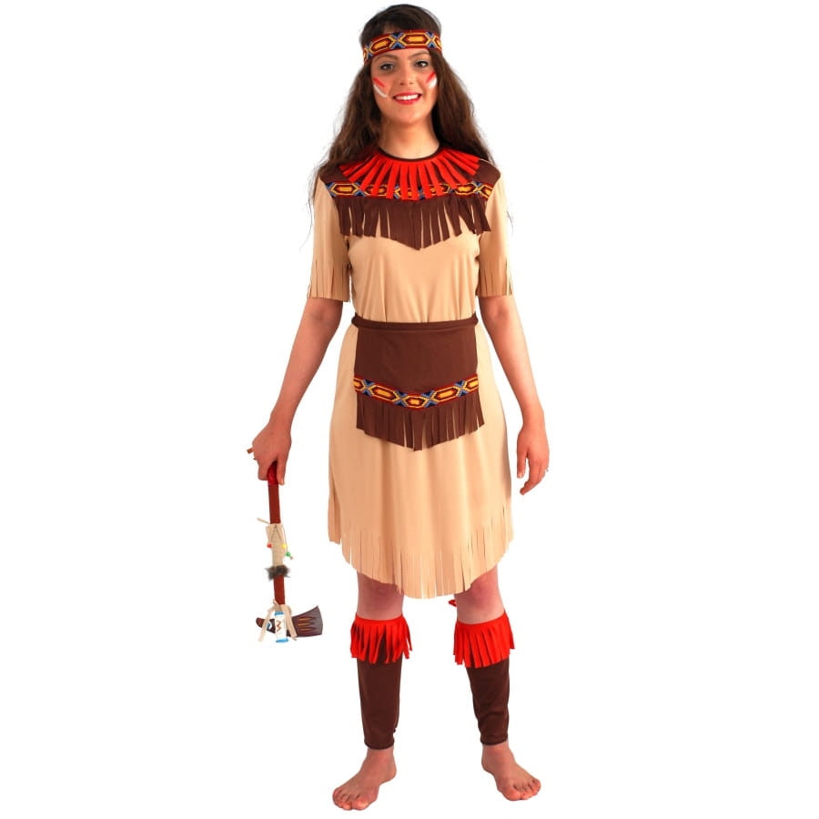 Si Pocahantas, une héroine amérindienne du début du 17ème siècle, vous inspire de par son courage en ayant eu une formidable histoire d'amour avec un homme blanc (en la personne de John Smith), alors enfilez vite cette tenue indienne longue flèche pour femme, de taille déclinée en 38-40/42-44/46-48, constituée d'une robe de couleur beige, d'un tablier de couleur marron, de guêtres de la même couleur et d'un bandeau multicolore. Invoquez les esprits en imitant la danse et le chant des Indiens. Comme accessoire, vous pourrez choisir un tomahawk, et les gens vous prendront pour une vraie Apache. Et dans la même foulée, pourquoi ne réécririons-nous pas l'histoire en disant que finalement, c'eut été Geronimo que Pocahantas aurait rencontré à la même époque ...