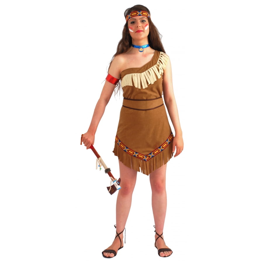 Ce déguisement d'indienne est composé de la robe avec une seule bretelle et orné de franges, la ceinture, le bandeau rouge pour le bras et le bandeau décoré pour la tête. Les tailles disponibles sont le 38/42 et le 44/46.
