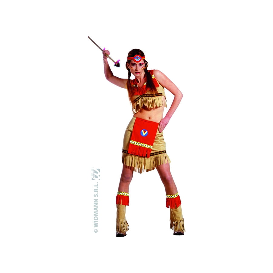 Costume western composé d'une jupe, de jambières, d'un gilet et d'un bandeau. Cet ensemble beige, marron et rouge est disponible en taille S, M ou L. Il est parfait pour se transformer en Indienne.