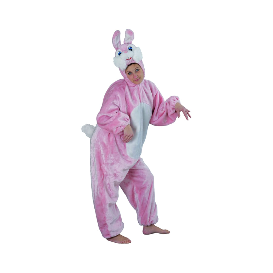 Costume lapin rose pour homme ou femme, composé d'un costume en peluche blanc et rose, d'un masque, de mains et de pieds assortis. Cet ensemble mesure 180 centimètres de hauteur. Il est parfait pour un carnaval.