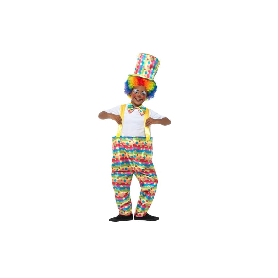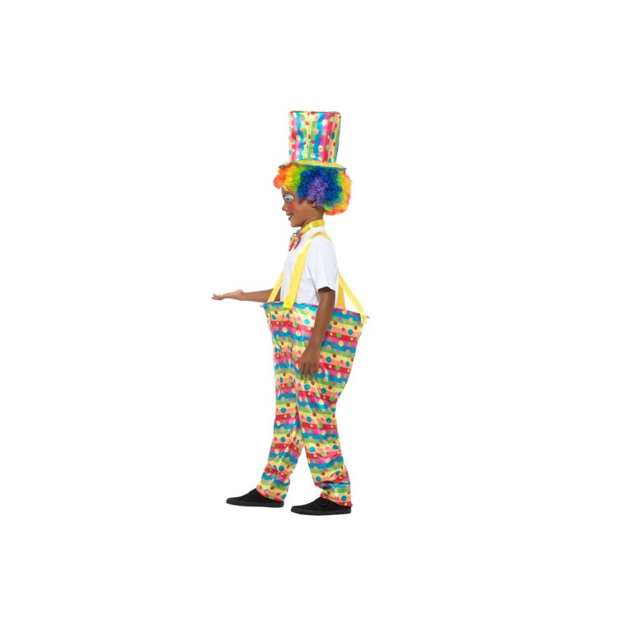 Un jeune clown s'engage à animer le goûter d'anniversaire. Vêtu de son costume large salopette colorée de petit clown, il va amuser petits et grands avec sa drôle d'allure. Le déguisement lui donnera en effet une silhouette un peu enrobée. En fait, le pantalon est un modèle à cerceau. Il est équipé de deux bretelles jaunes et il est parsemé d'une multitude de pois multicolores. Comme accessoire, vous disposerez d'un gros noeud papillon de couleur assortie au pantalon. Un grand chapeau haut-de-forme viendra compléter la série. Celui-ci affiche également les même couleurs et motifs que sur le pantalon. Comme sur la photo, un petit haut blanc sera parfait pour accompagner la tenue. Différentes tailles sont proposées pour l'article, correspondant aux 4 à 12 ans.