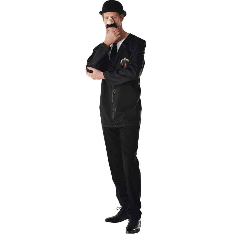Il est temps cette fois-ci de changer de costume. "Je dirais même plus", qu'il est grand temps de se démarquer un peu ! Les détectives Dupond et Dupont sont les deux policiers dans "Les Aventures de Tintin", à la fois maladroits et indiscrets, ces deux personnages ont une manière de s'habiller un peu particulière. Si vous voulez adopter leur costume, cet ensemble est fait pour vous : une veste imprimée de couleur noire avec un haut, sur laquelle on peut distinguer une image des deux équipiers ; un chapeau noir tout à fait identique à ceux qu'on retrouve dans le dessin animé ; un faux-nez avec moustache pour pouvoir imiter ces personnages. Vous pouvez vous amuser à interpréter les deux rôles en changeant la forme de la moustache : celle de Dupond est droite ou en forme de D incliné, alors que celle de Dupont est troussée ou en forme de T épais renversé. A présent, place à vos enquêtes chers détectives !