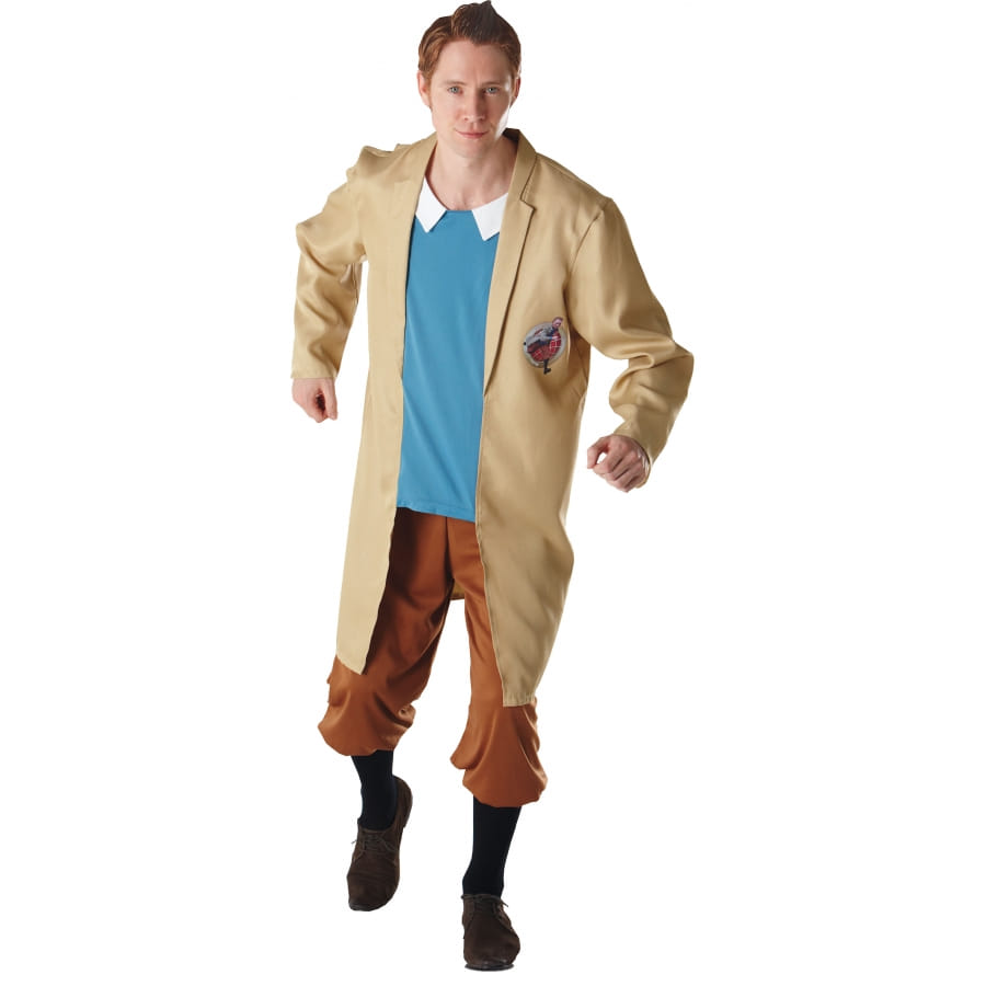 Devenir un jeune reporter et enquêter sur des histoires mystérieuses ? C'est possible, en tout cas seulement pour Tintin. Déguisez-vous en ce grand personnage qui nous a tous fasciné de par ses histoires et ses aventures. Ce costume sous licence Tintin est idéal ! Il est constitué d'une longue veste imprimée de couleur beige sur laquelle on peut distinguer l'image de notre héros, d'un haut bleu avec un faux col blanc, qui nous rappelle le pull que Tintin porte à chacune de ses épopées, d'un pantalon de couleur marron remonté légèrement à mi-jambe comme celui de notre personnage. C'est à vous de parfaire la tenue avec les hautes chaussettes noires, les chaussures marron, et les cheveux remontés avec du gel. A vous les aventures !