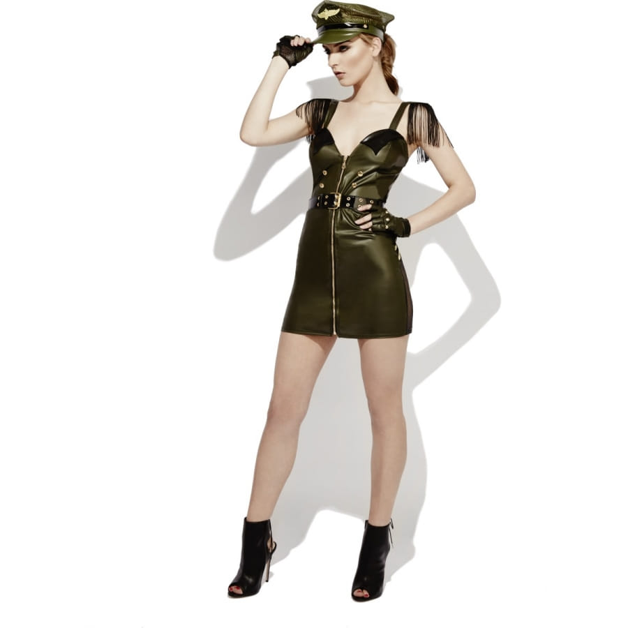 Mesdames, pour incarner une guerrière de charme, choisissez ce déguisement de militaire sexy. Pour toutes les femmes, se déclinant dans les tailles L/M/S/XS, il rehaussera à coup sûr votre charme. La tenue est composée d'une mini robe très décolletée, serrée, près du corps, avec une fermeture sur le devant et des franges en guise de courtes manches sur les épaules. Elle sera d'autant plus cintrée grâce à la ceinture de type militaire qui accompagne le costume. Avec cela, une casquette avec l'emblème de l'armée, ainsi que des petits gants viennent fignoler l'ensemble, qui est d'une belle couleur vert kaki. A tout ceci s'ajoute l'effet mouillé de la tenue, qui ne fait qu'accentuer le côté sexy. Portée avec des talons aiguille, cette tenue vous permettra de vous déguiser en soldat ou en officier de charme pour la Saint-Valentin ou lors d'une soirée jeu de rôle sur le thème de la guerre. N'oubliez surtout pas de vous maquiller en circonstance, les produits adéquats sont à retrouver dans notre rubrique cosmétique.