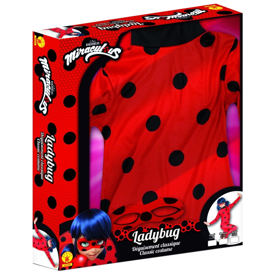 Ce coffret cartonné contient la combinaison de Lady Bug entièrement rouge et décorée de gros points noirs.