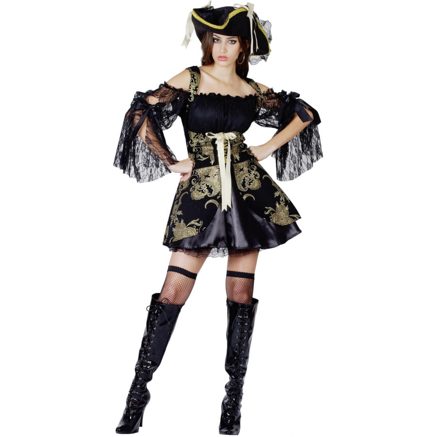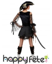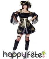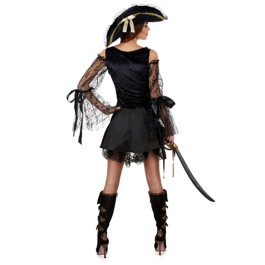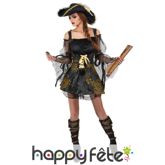 Mesdames, soyez belles à l'occasion de la fête des morts, tout en enfilant votre tenue de pirate. Si l'idée vous tente, nous avons le déguisement qu'il vous faut. En effet, nous vous proposons le costume noir satiné et dentelle de piratesse, qui reste disponible sur notre site. Il se compose d'une robe courte et évasée de couleur noire. Un gilet à lacet vient se mettre dessus. Celui-ci est assorti au bas de la robe, car ils sont conçus dans un tissu satiné noir, à motif doré. Les manches de la robe constituent un voile qui recouvre l'ensemble. Un chapeau de pirate bordé de dentelle dorée et de voile noir s'ajoute à ce déguisement pour le rendre encore plus original !
