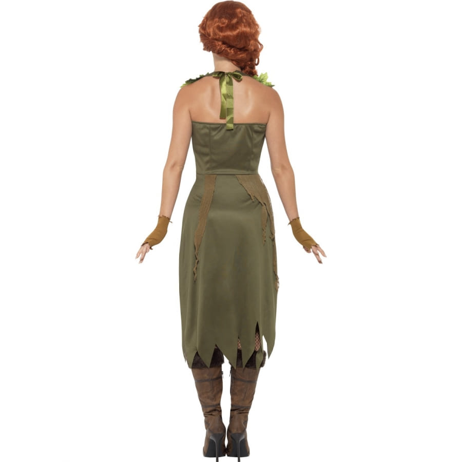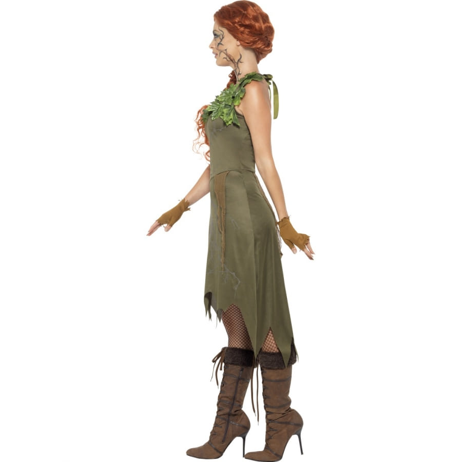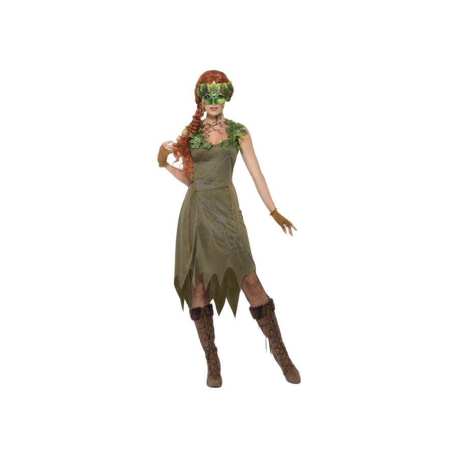 Si vous avez toujours défendu ardemment la nature et avez toujours rêvé de prendre soin de la forêt, de sa faune comme de la flore. Mesdames, nous allons vous en donner l'occasion avec ce déguisement de nymphe de la forêt, ces êtres dont la raison de vivre est la forêt elle-même. Ce déguisement comprend une robe évasée et en lambeaux vers le bas, de couleur verte, dont les bretelles sont ornées de feuilles, ainsi qu'une paire de gants plus ou moins déchirés, de couleur verte, d'où vos doigts vont dépasser. Les tailles proposées sont L, M et S. Les vraies nymphes porteraient cet accoutrement avec les pieds nus mais ne vous inquiétez pas, vous, vous pourrez porter des sandales, des escarpins ou une paire de bottes.